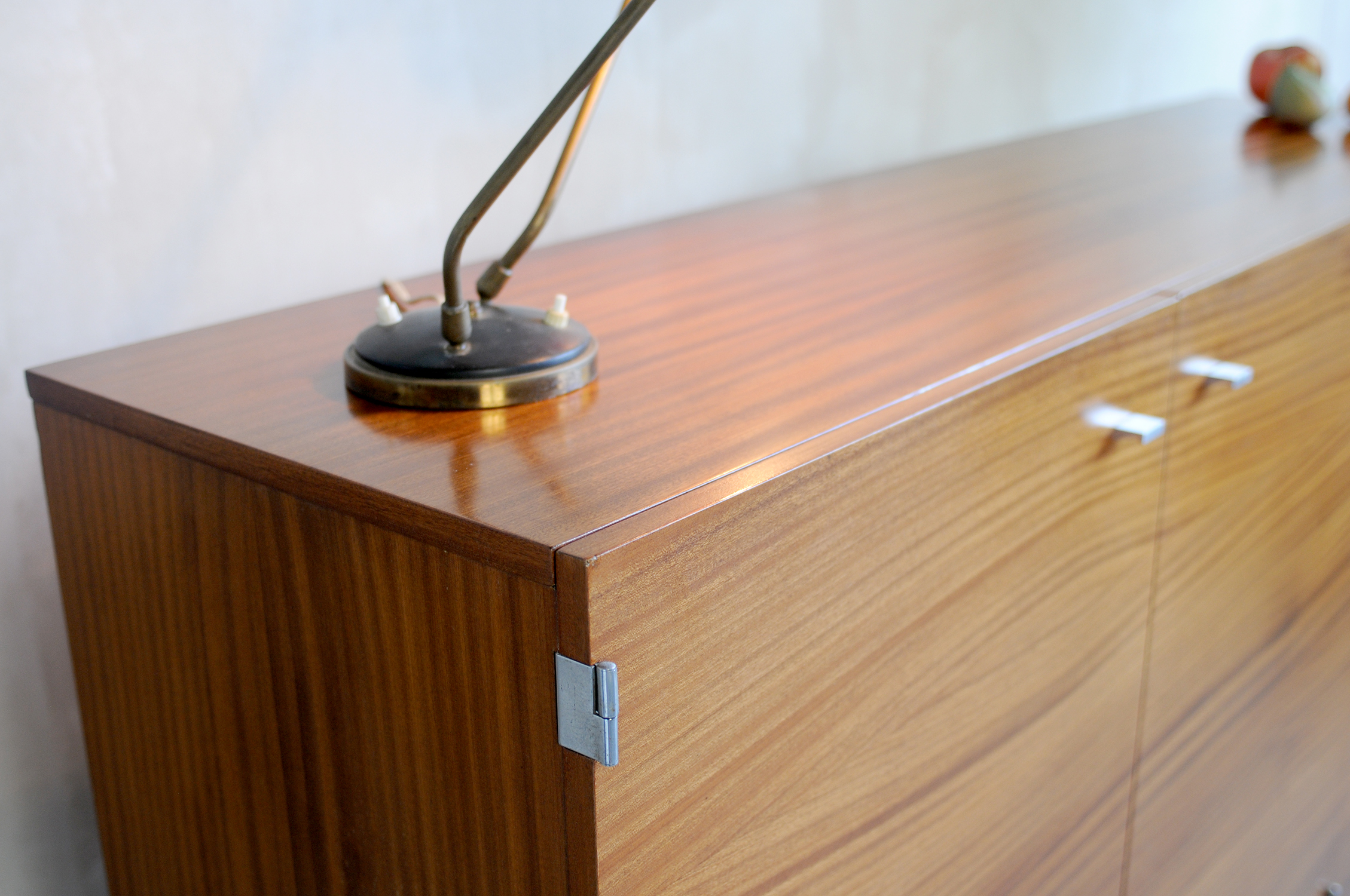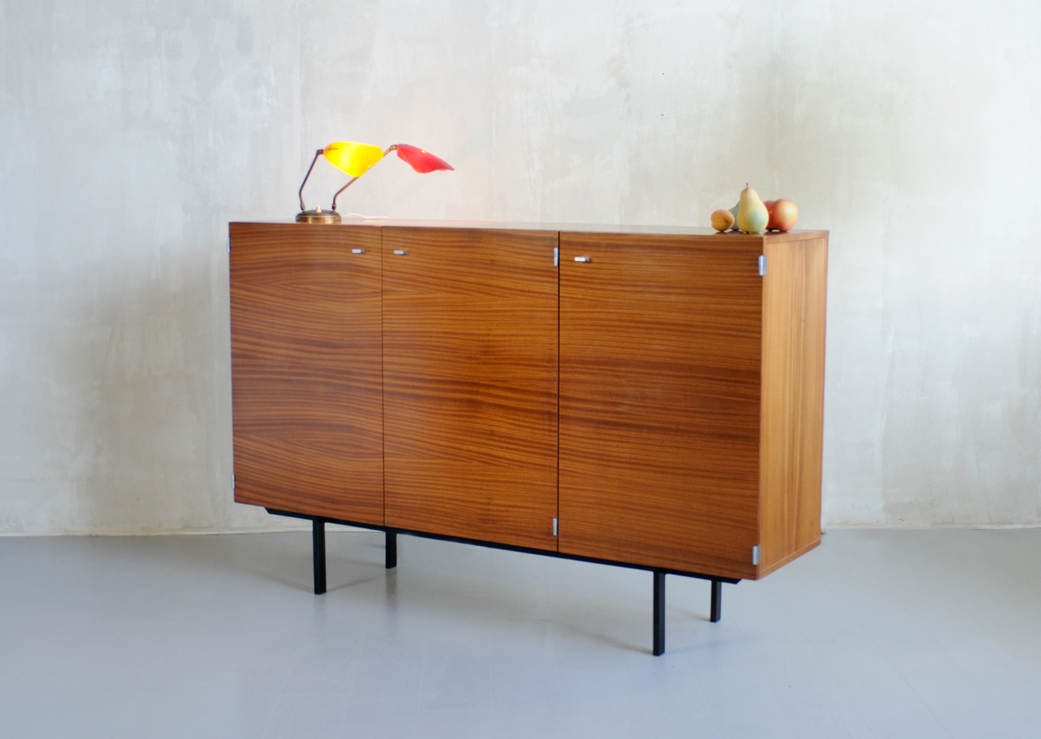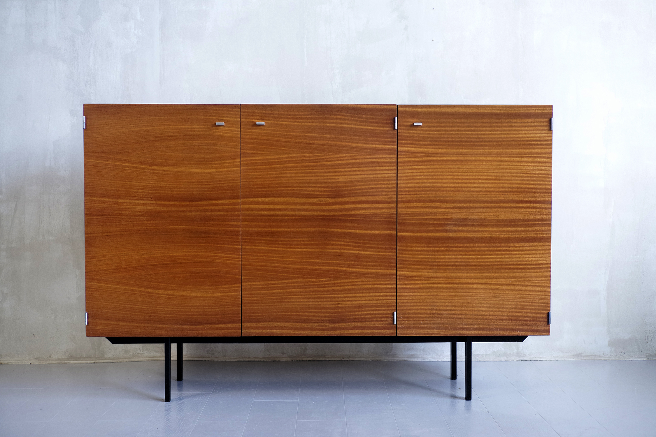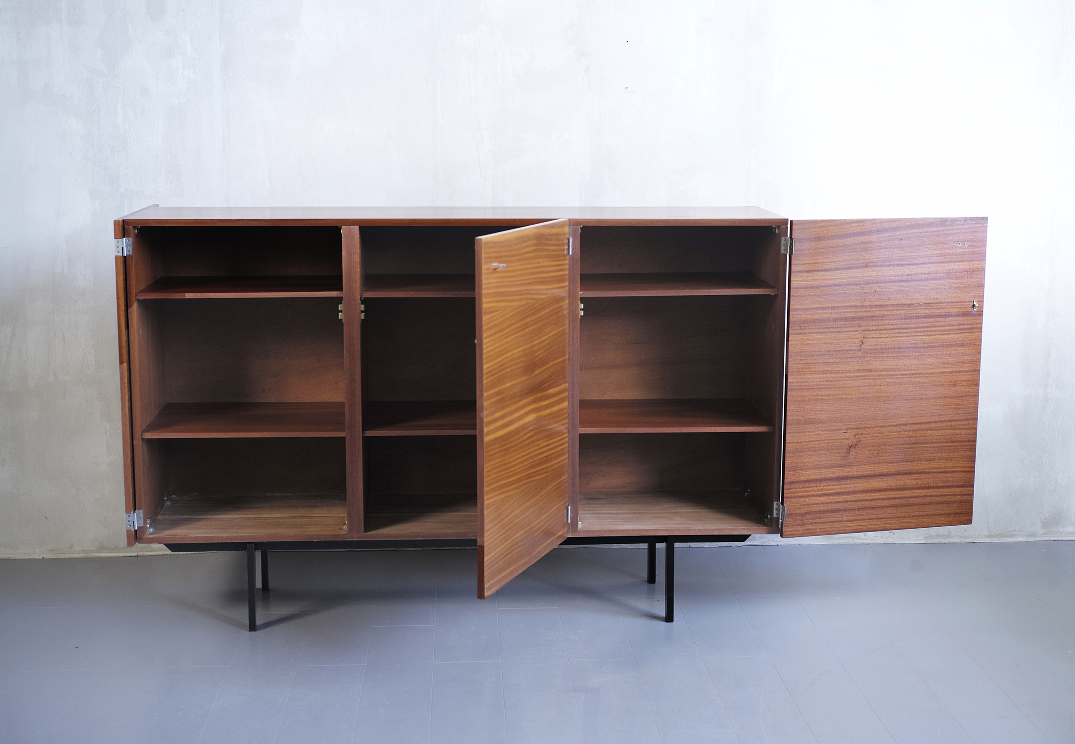 Enfilade à trois portes de Pierre Guariche pour Meurop, Belgique 1960. Piètement métallique laqué noir, poignées et gonds en métal poli.