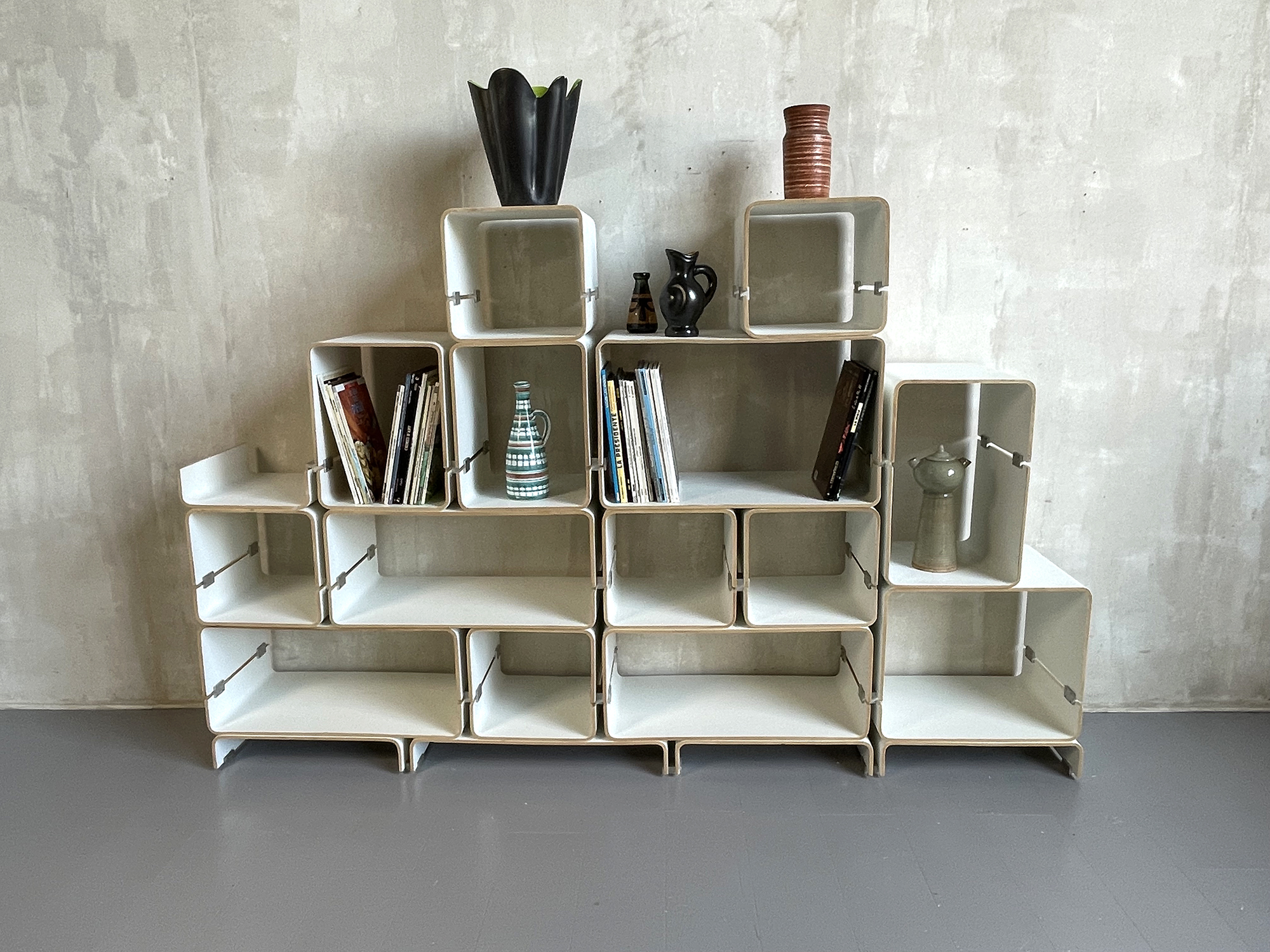 Structurée autour de deux éléments assemblés par une pièce en aluminium, cette bibliothèque est entièrement modulable. Composée de 14 caissons, on peut l'agencer à volonté grâce notamment aux différentes formes des pièces de jonction.