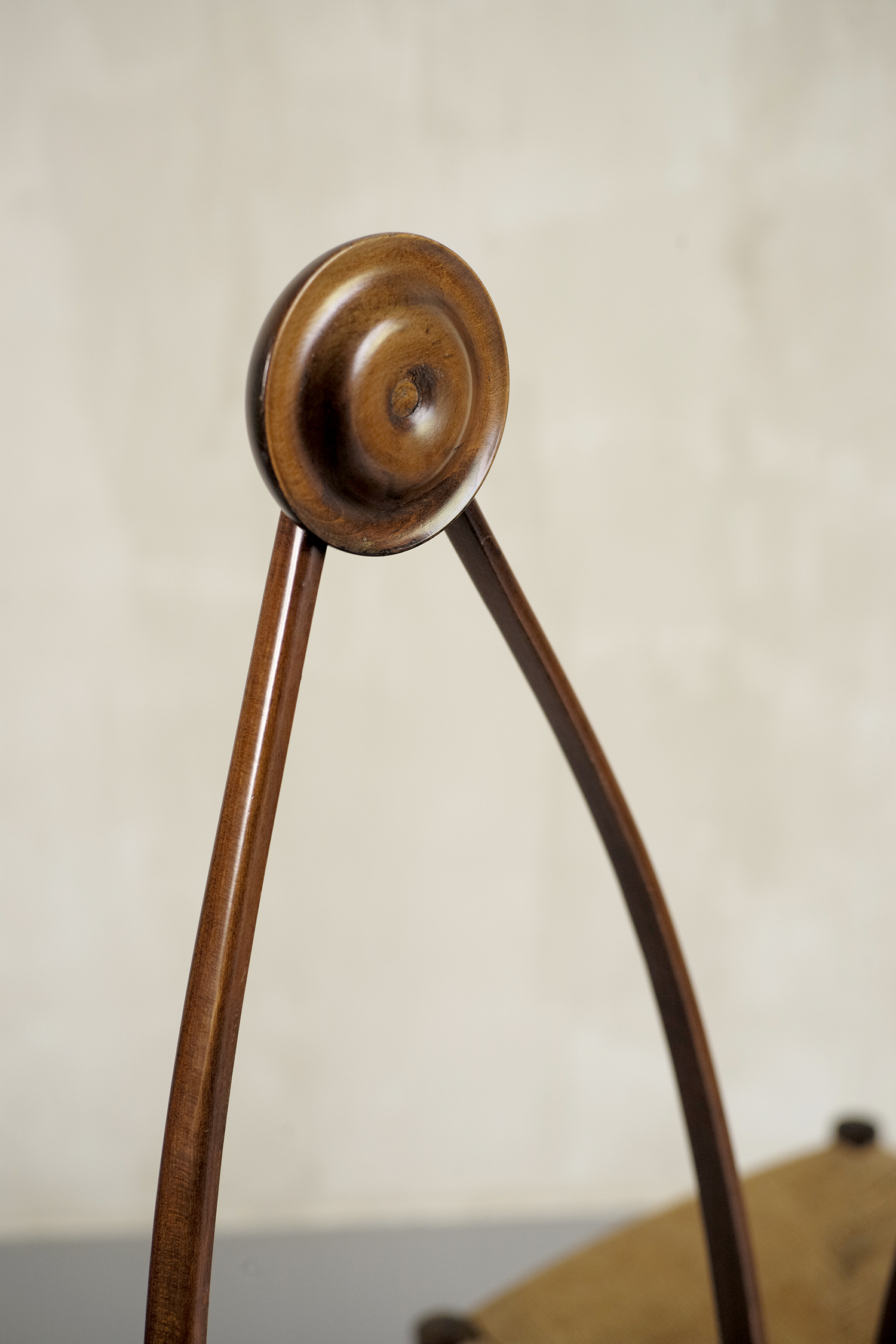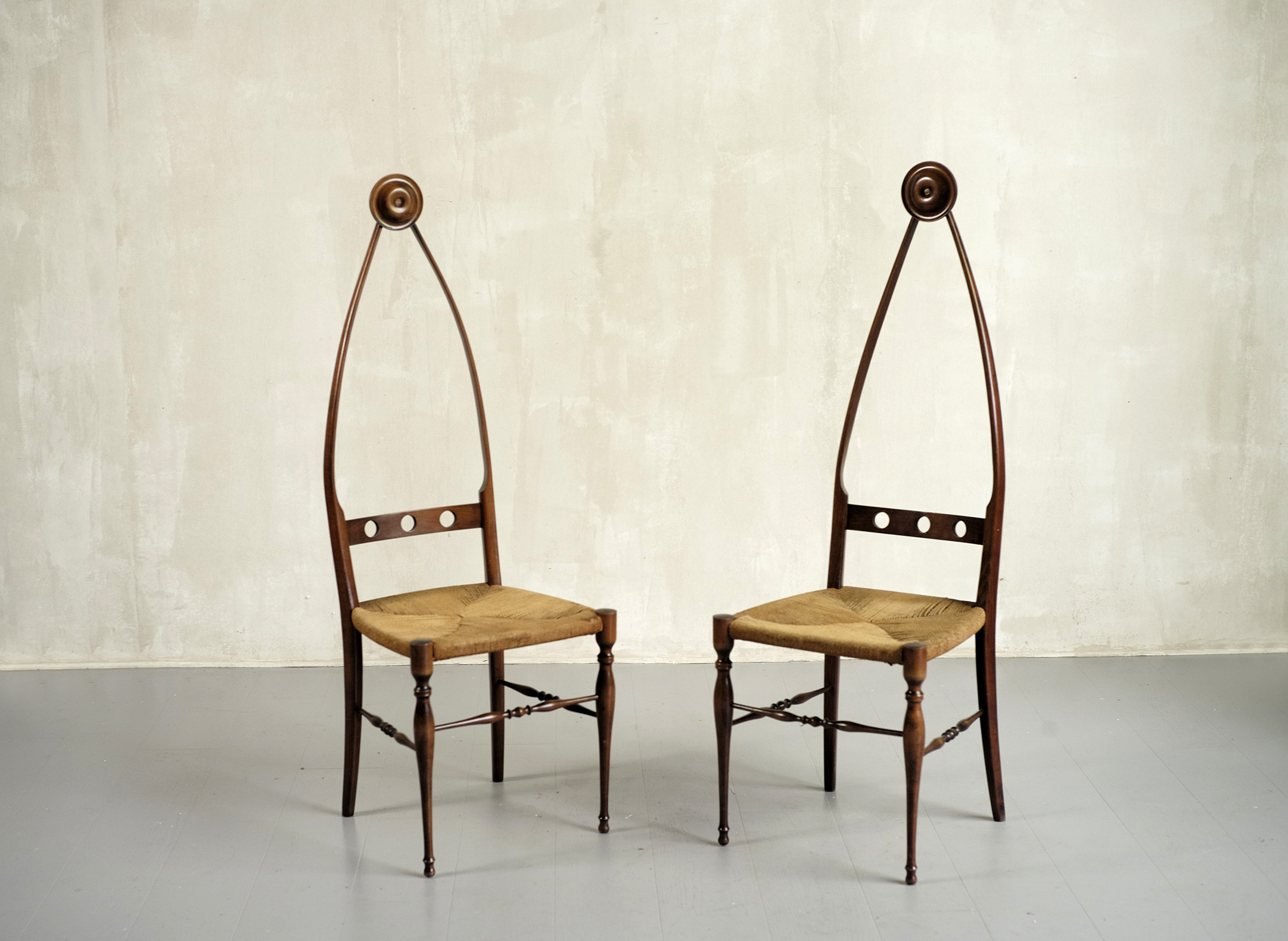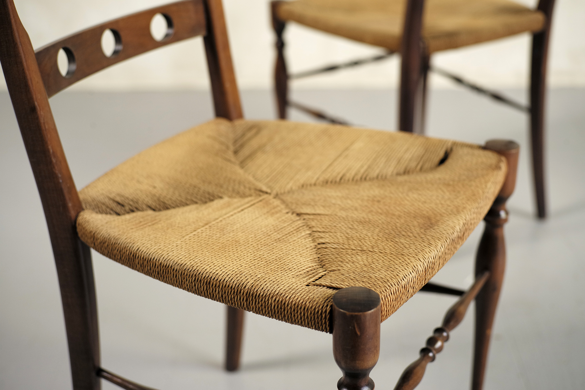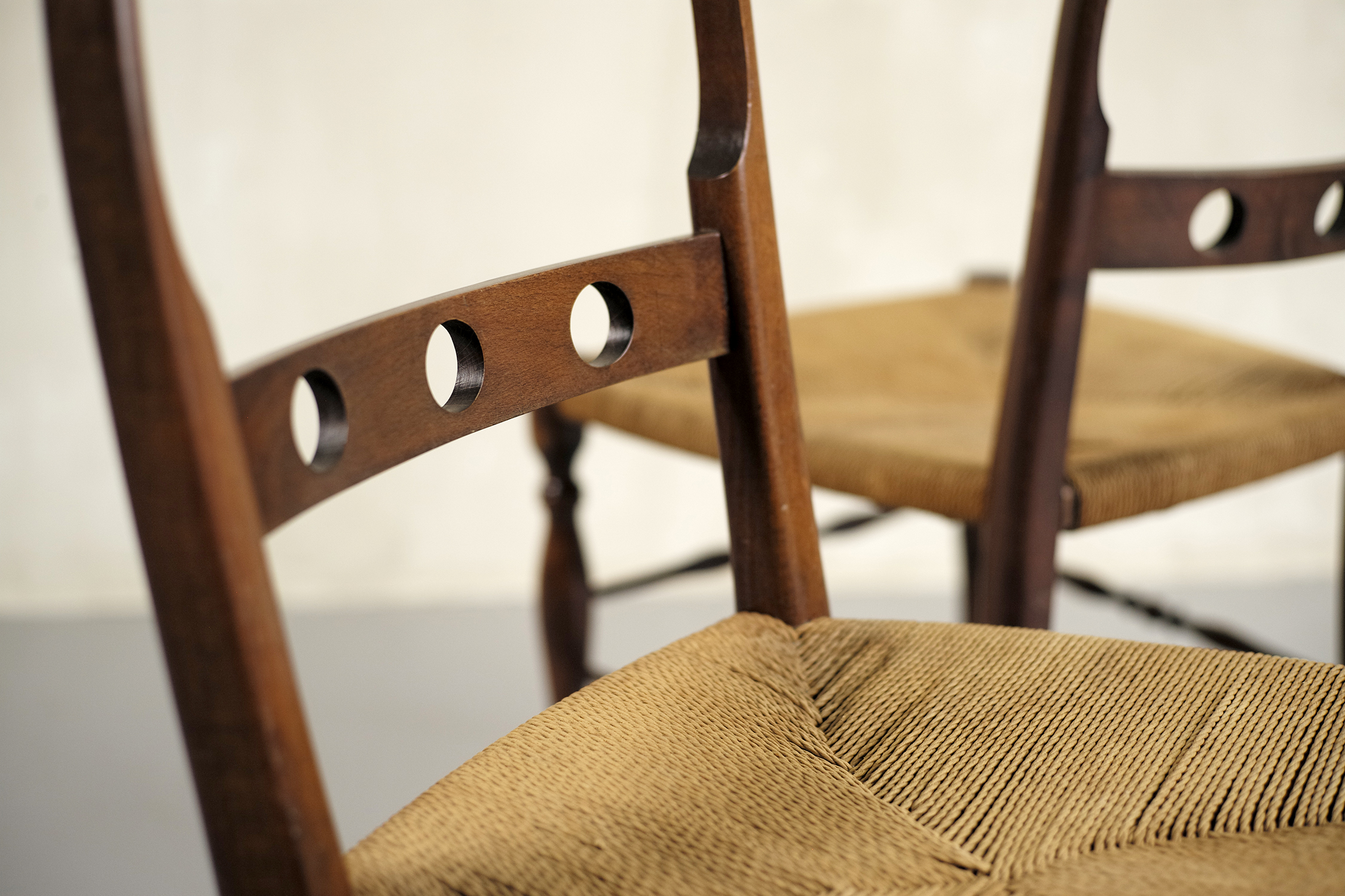 Paire de chaises d'apparat par Pozzi et Verga, Italie 1950. Assise en corde, structure en bois verni. D'un design d'une grande élégance, ces fauteuils sculpturaux allient confort et légèreté.