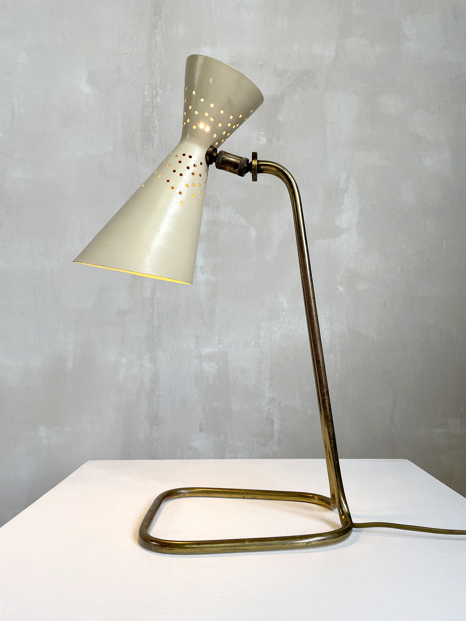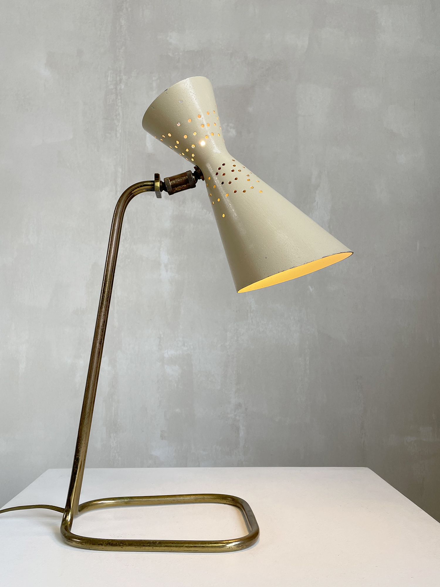 Jacques Biny pour Luminalite, rarissime lampe de bureau en métal tubulaire doré, réflecteur diabolo à perforations, laqué jaune pâle et blanc. La base est constituée d'un seul tube cintré, réuni au sommet par une platine. La double rotule permet l'orientation et le pivotement du réflecteur.