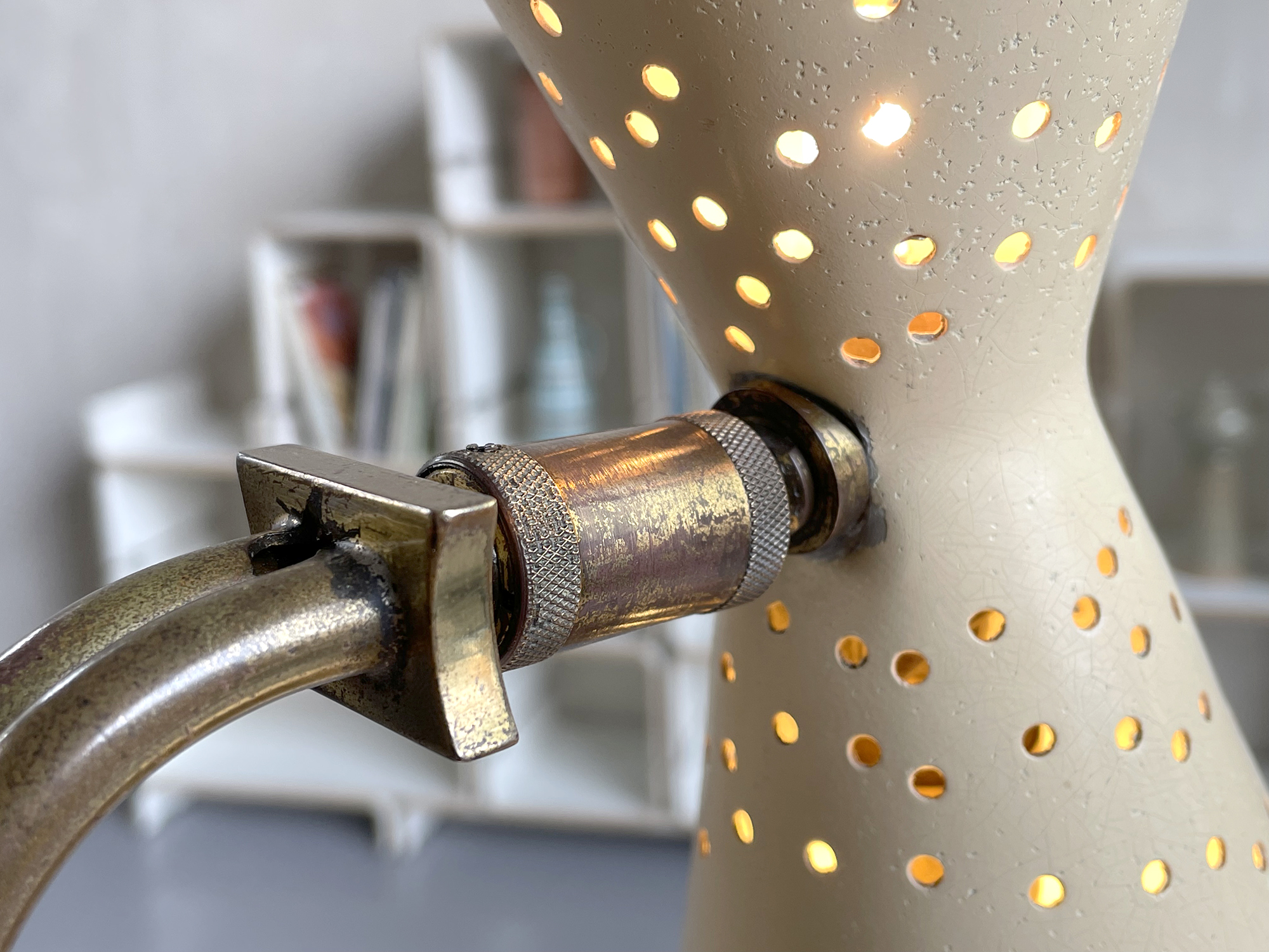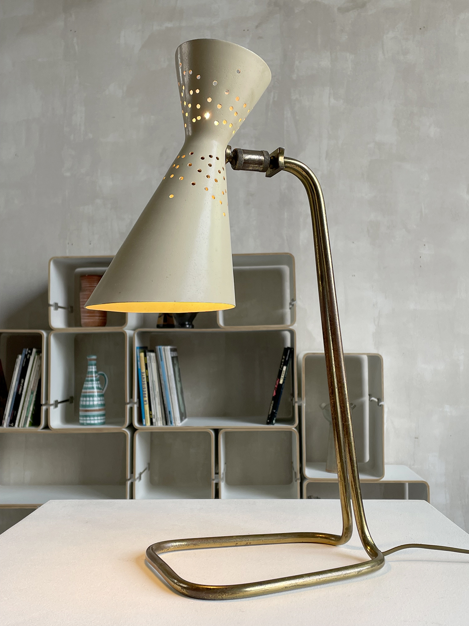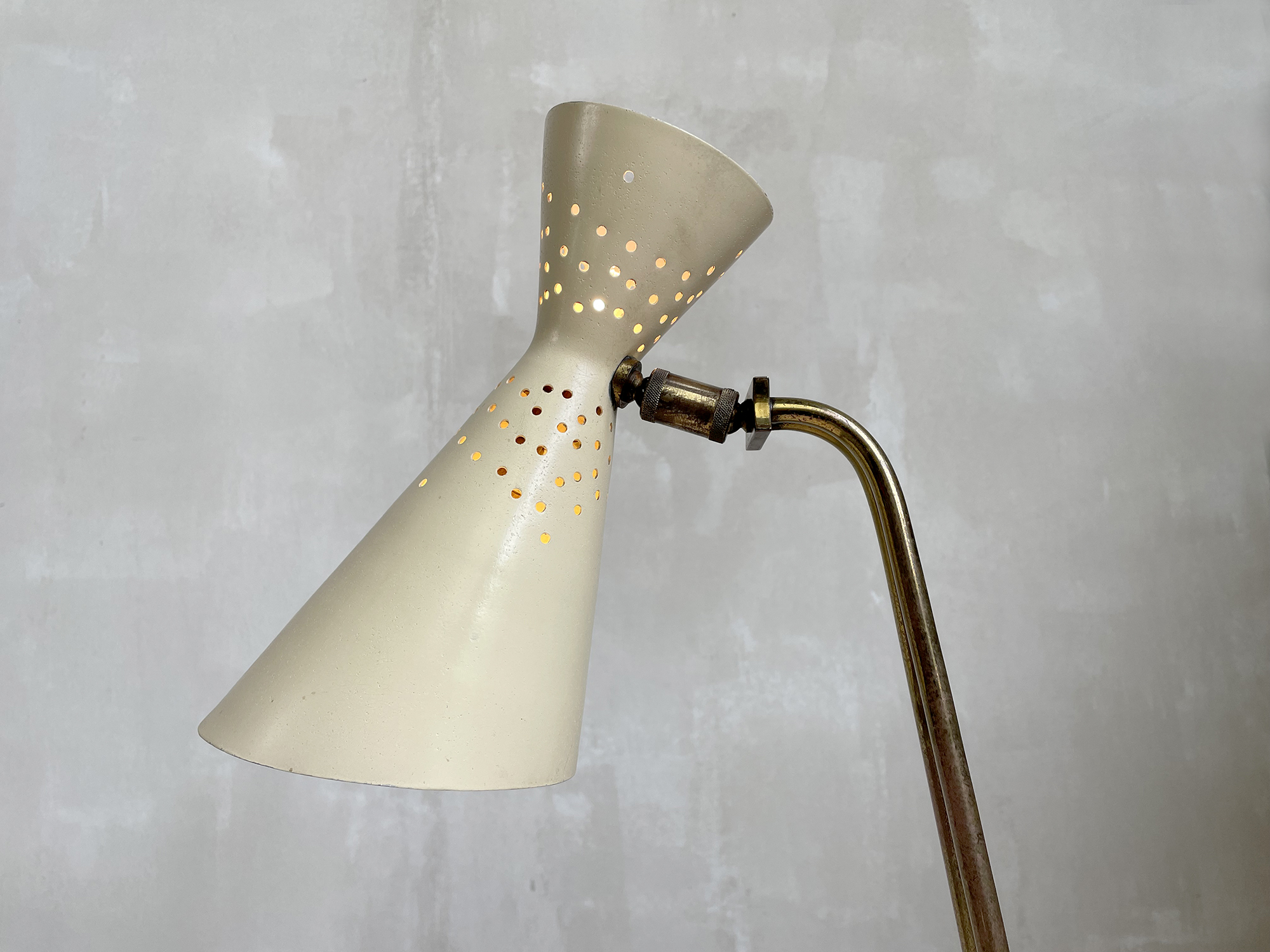Une photo d'archive montre cette lampe dans une version avec un réflecteur diabolo en papier, le luminaire que je vous propose n'était pas connu dans cette version jusqu'à présent.