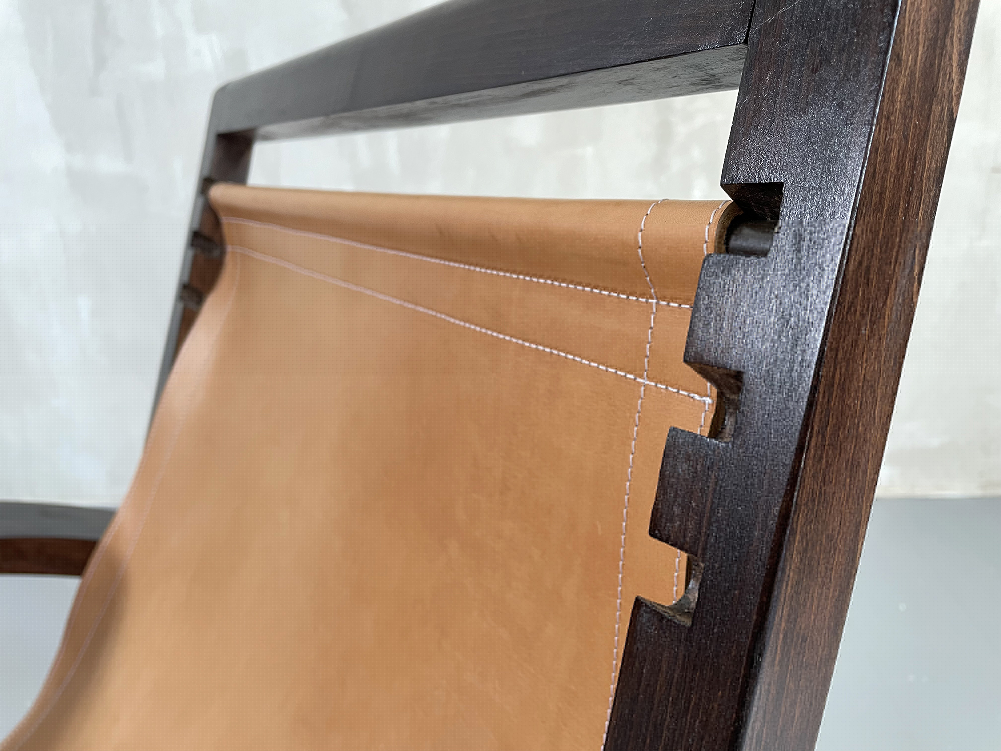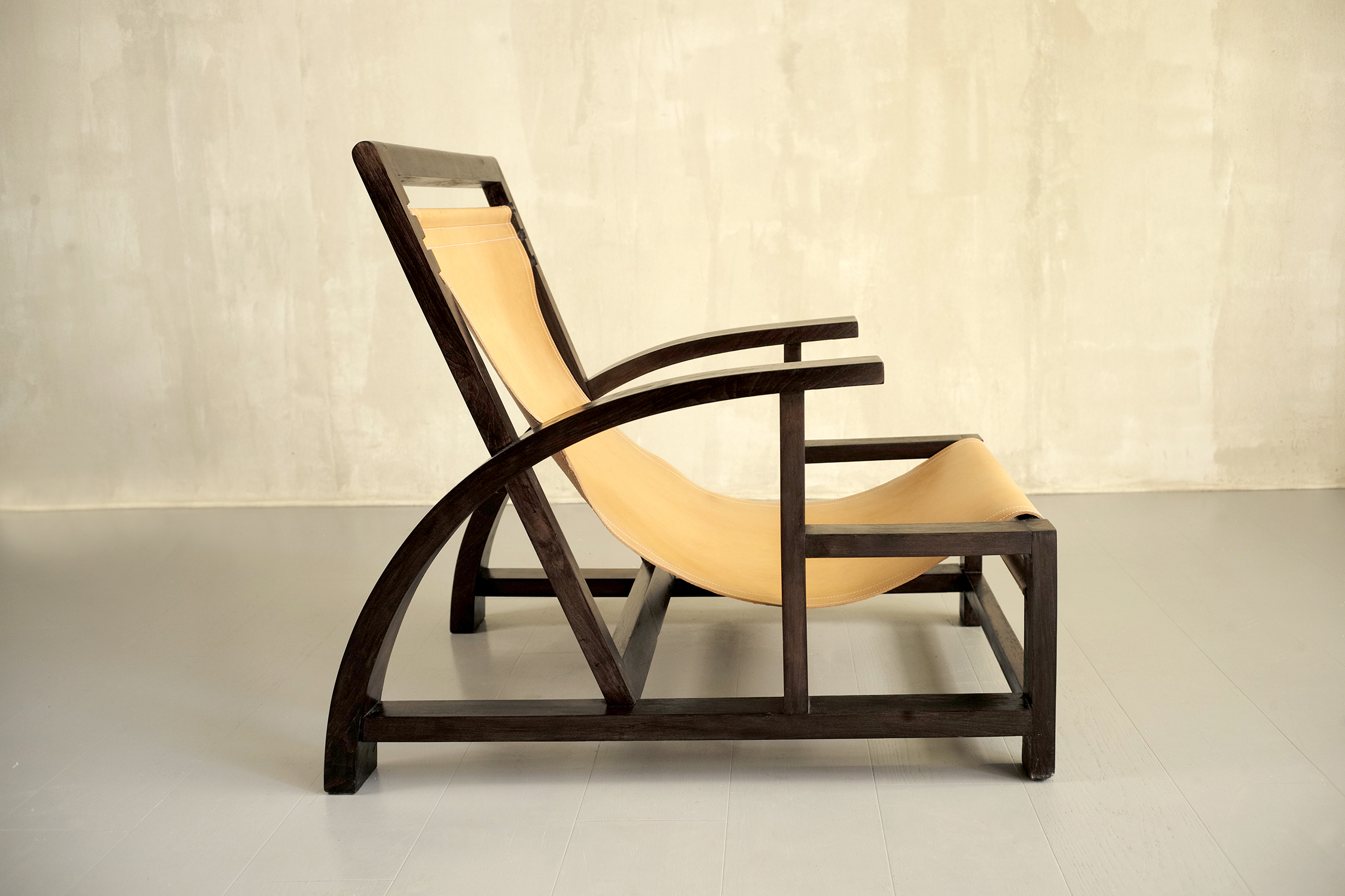 Grand fauteuil en bois noirci et cuir tendu, 1930. Le dessin moderniste alterne la courbe des accoudoirs, la diagonale du dossier, et les plans verticaux et horizontaux du piètement. L'assise est constituée d'une bande de cuir naturel surpiqué, enserrant deux barres en laiton massif. Trois encoches à l'arrière permettent de régler la hauteur d'assise.
