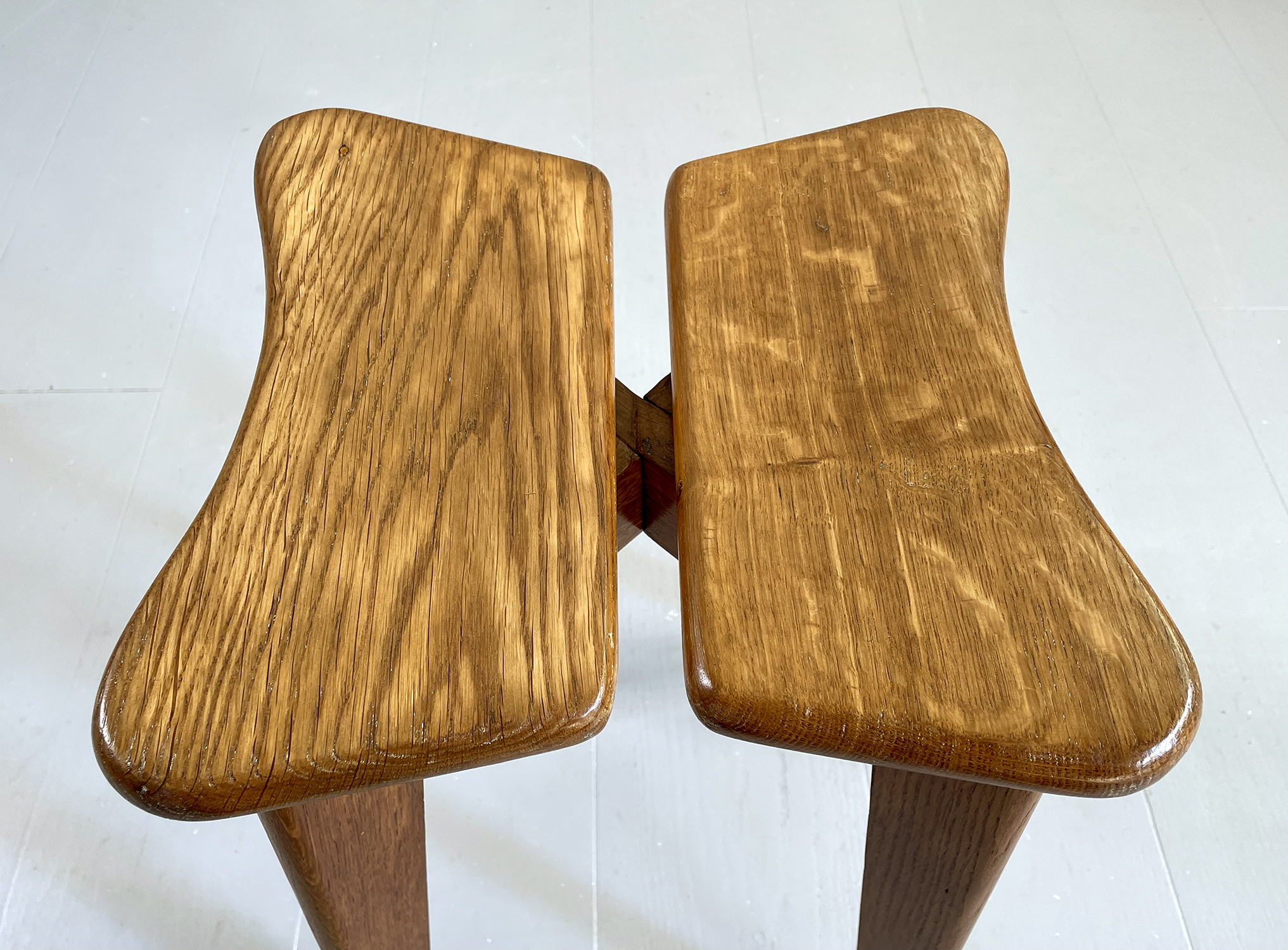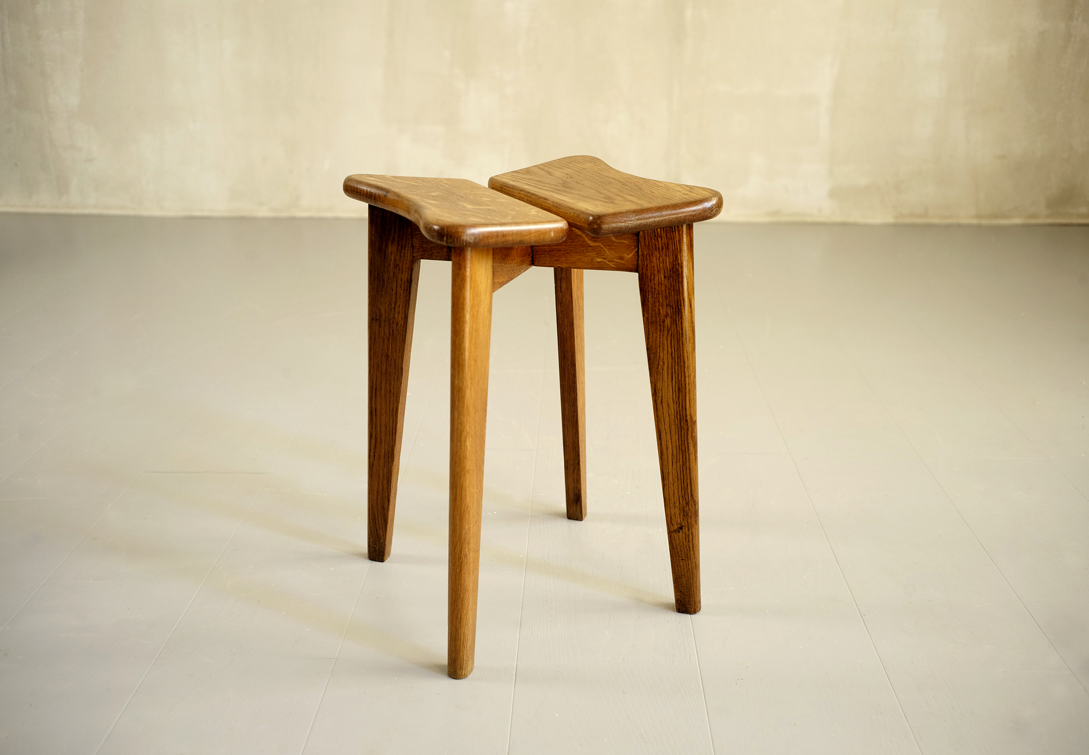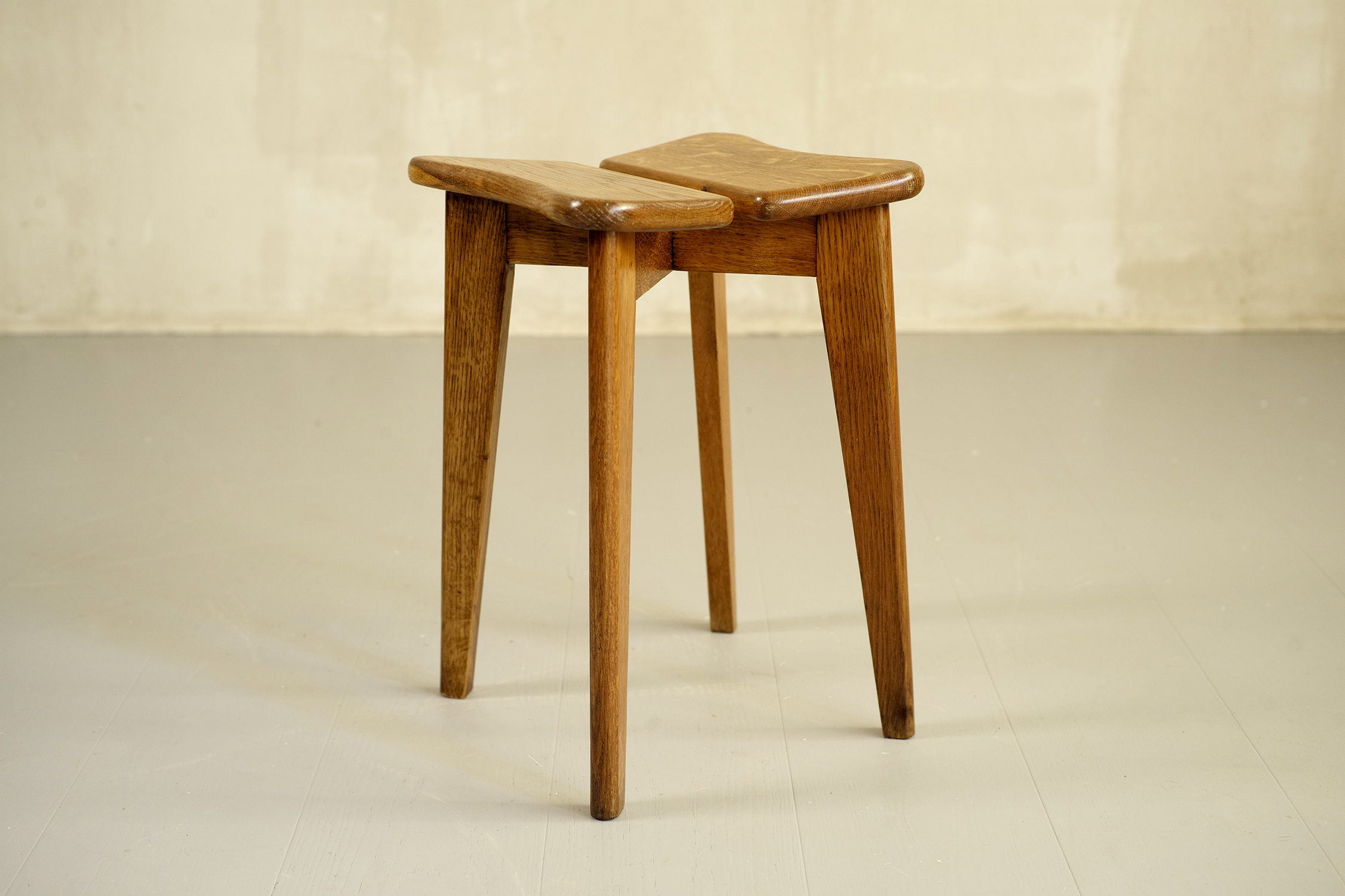Marcel Gascoin (1907-1986), Tabouret "Trèfle" en chêne massif, édition Arhec, Reconstruction française 1950. Sur une base quadripode fuselée, Marcel Gascoin dispose une assise en deux parties évoquant la forme d'un trèfle.