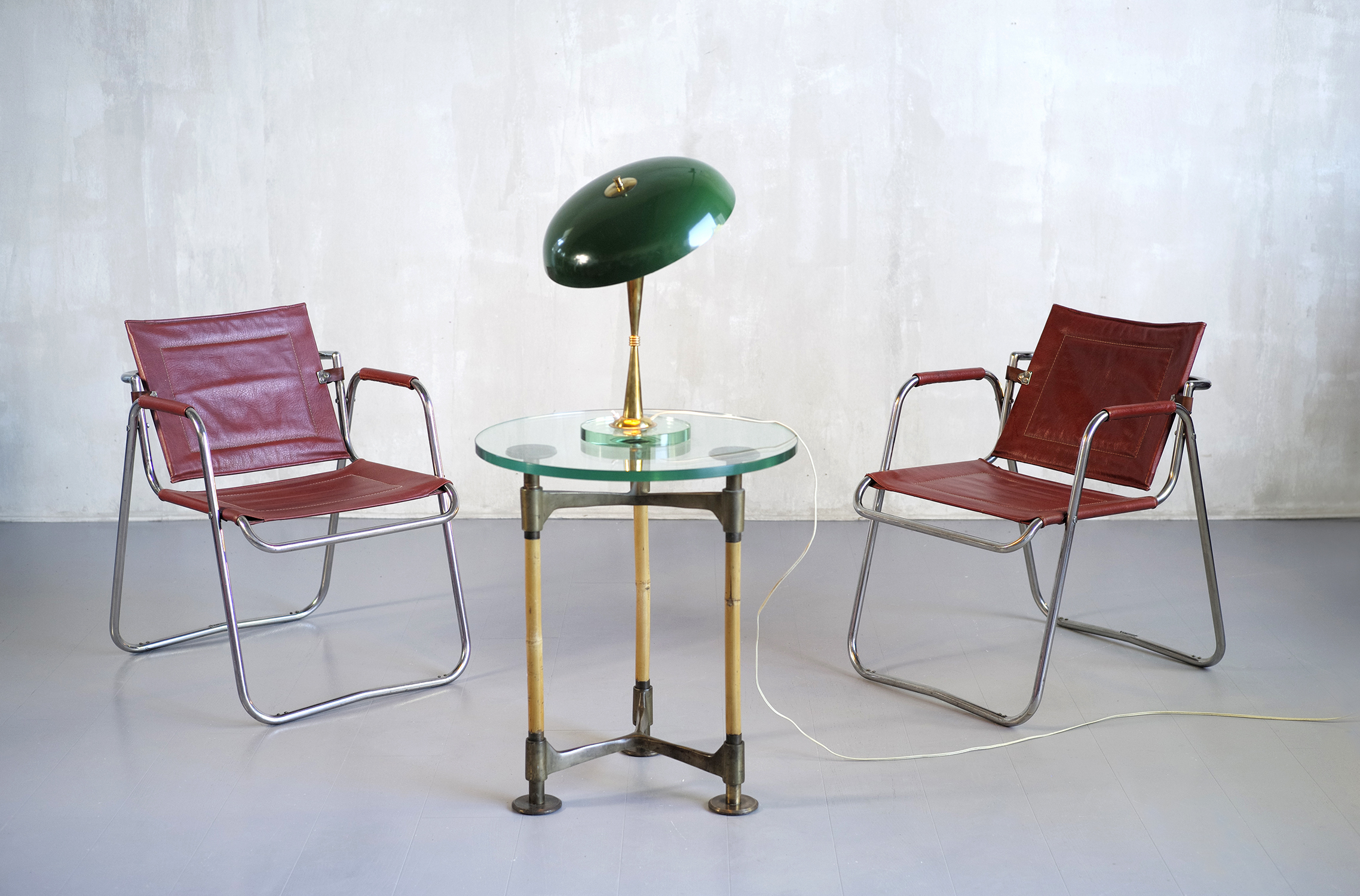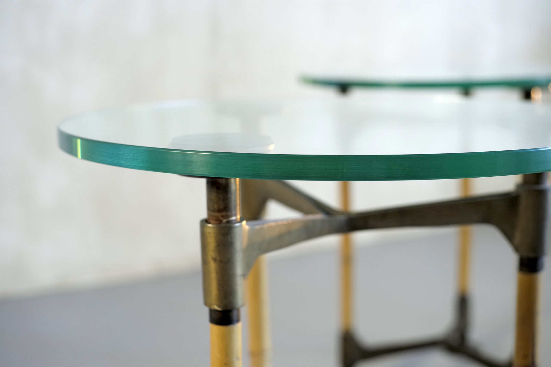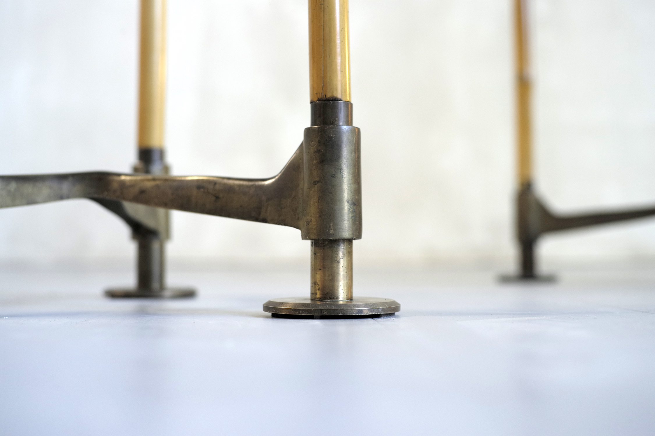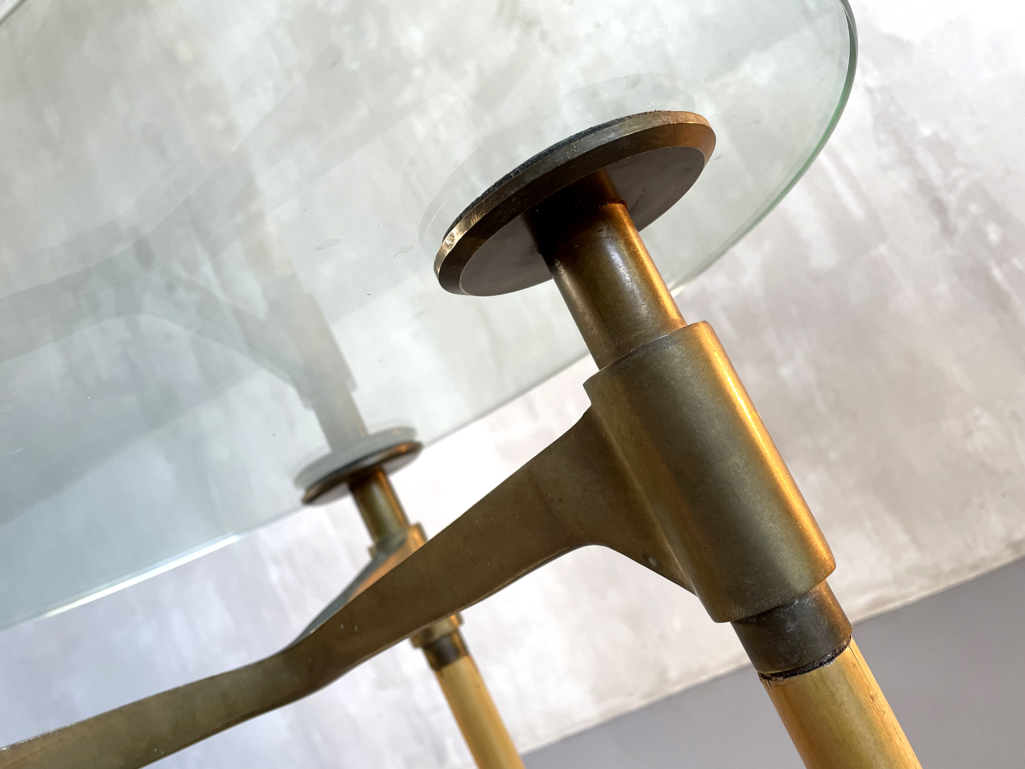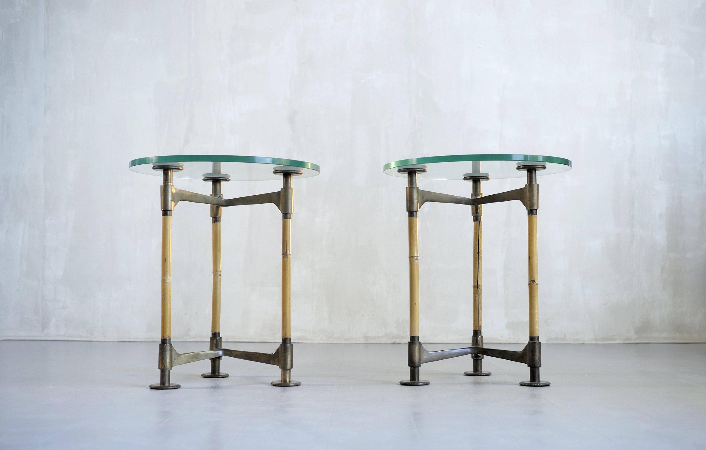 Elégante paire de tables tripodes en bronze, bambou et dalle de verre, Italie 1970. Les montants en bambou sont réunis par deux entretoises en bronze patiné, terminées par de larges patins circulaires. L'épaisse dalle de verre circulaire repose sur des patins en cuir noir.