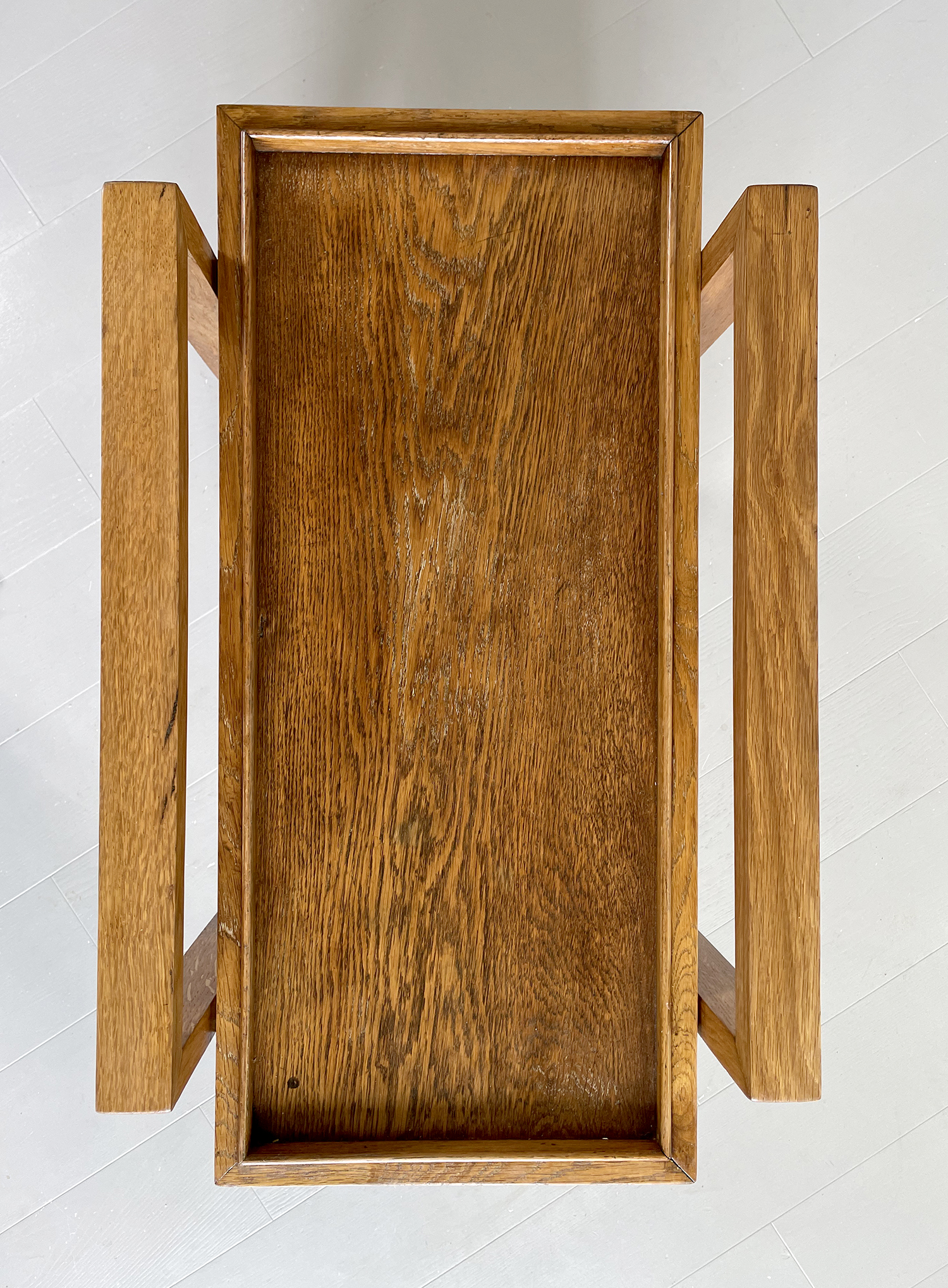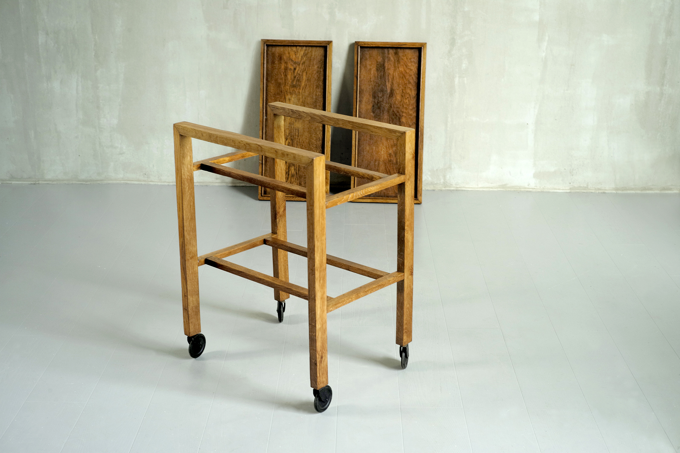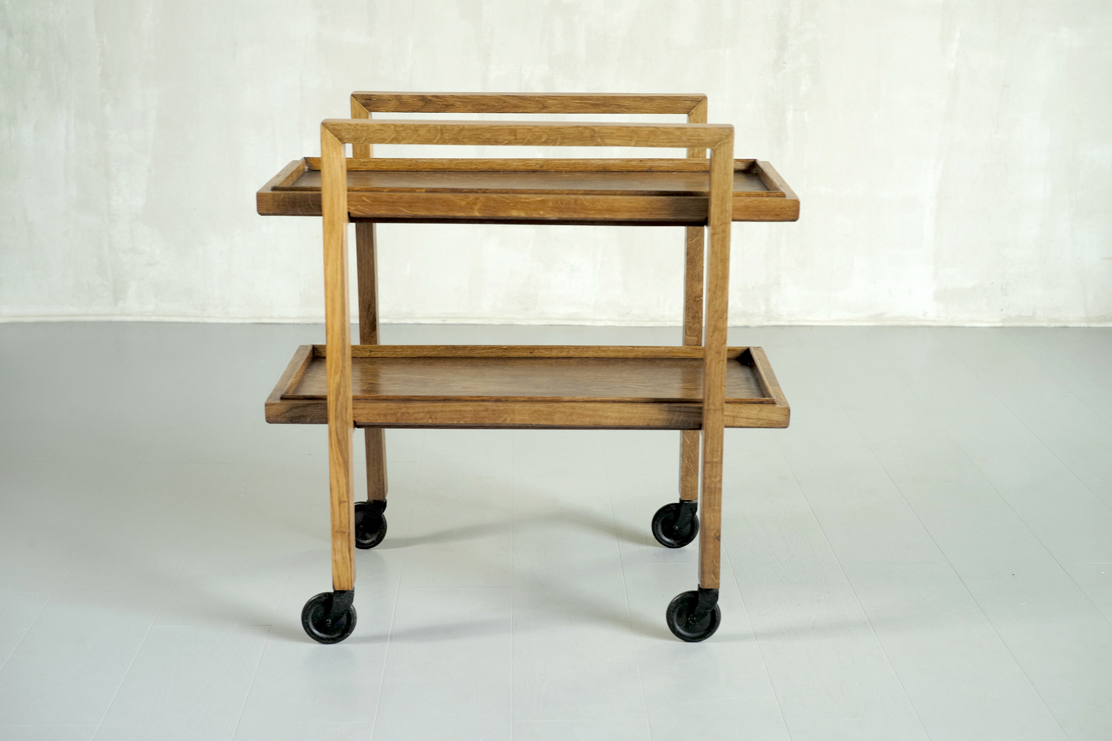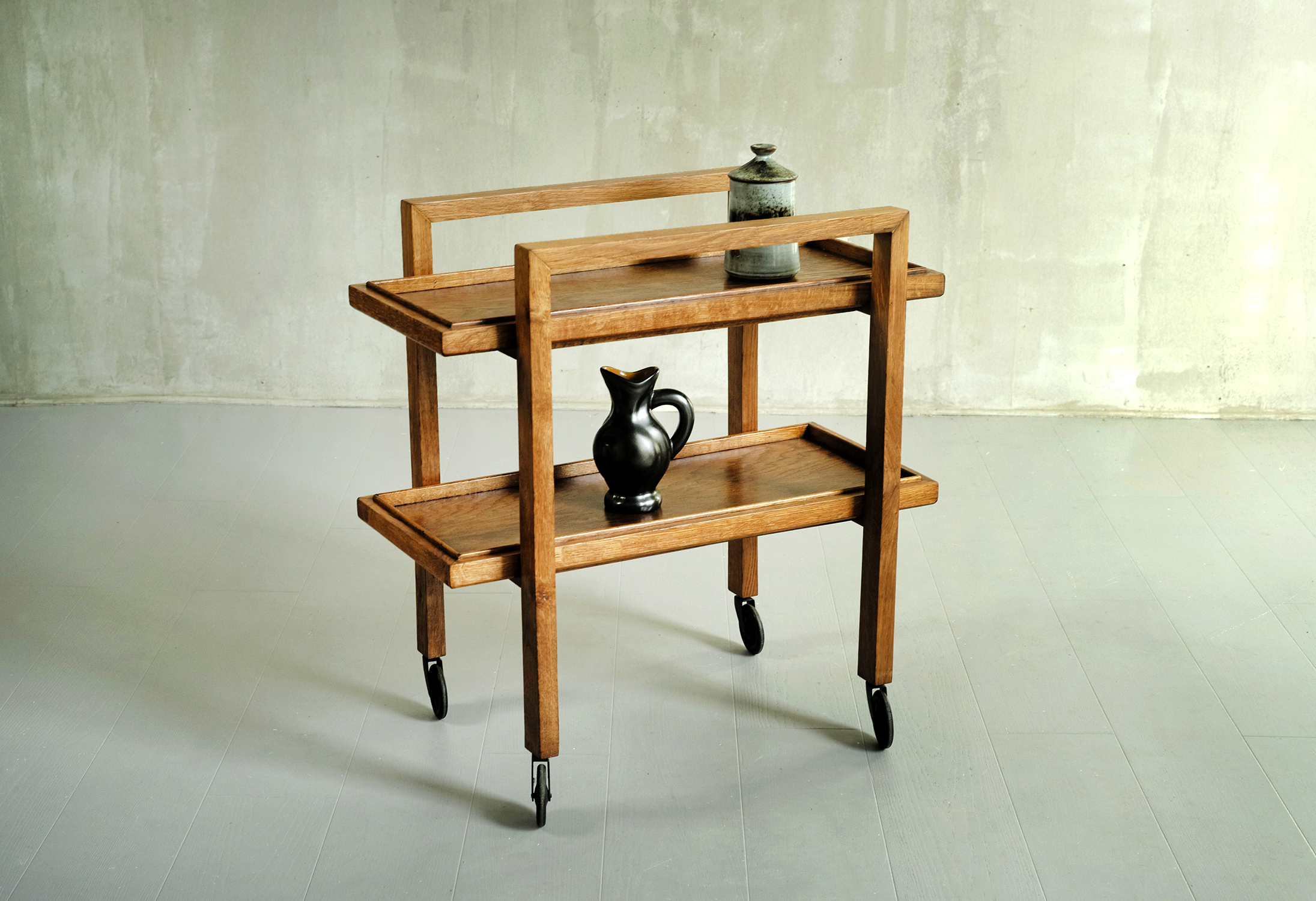 Desserte à deux plateaux amovibles RG 15 en chêne blond par René Gabriel, France 1946. Conçue en 1937, cette table roulante est un chef-d'œuvre de sobriété et de rationalisme. Les deux arches sont reliées par des entretoises formant le support des deux plateaux. Quatre grandes roulettes laquées noires assurent une mobilité parfaite.