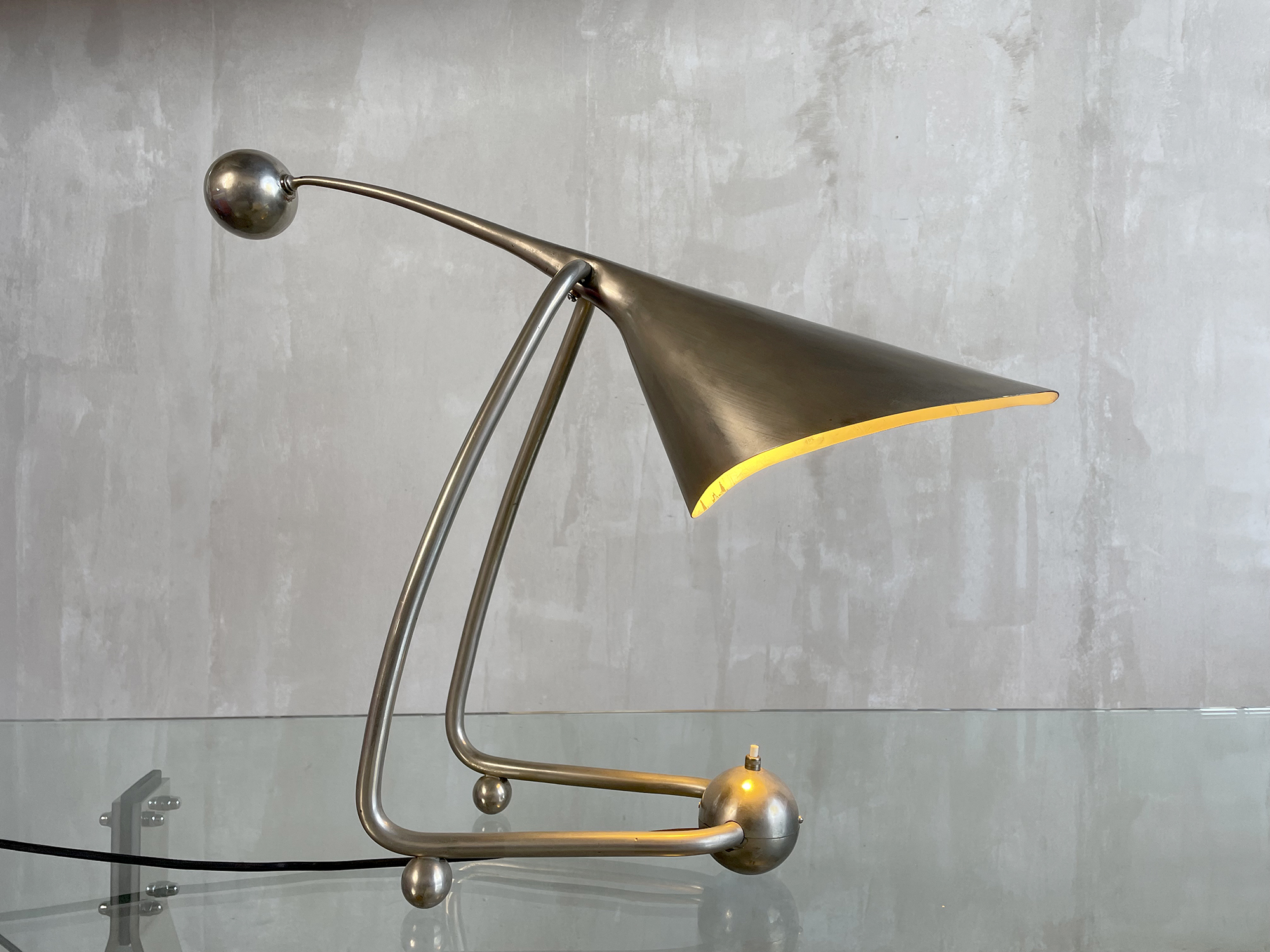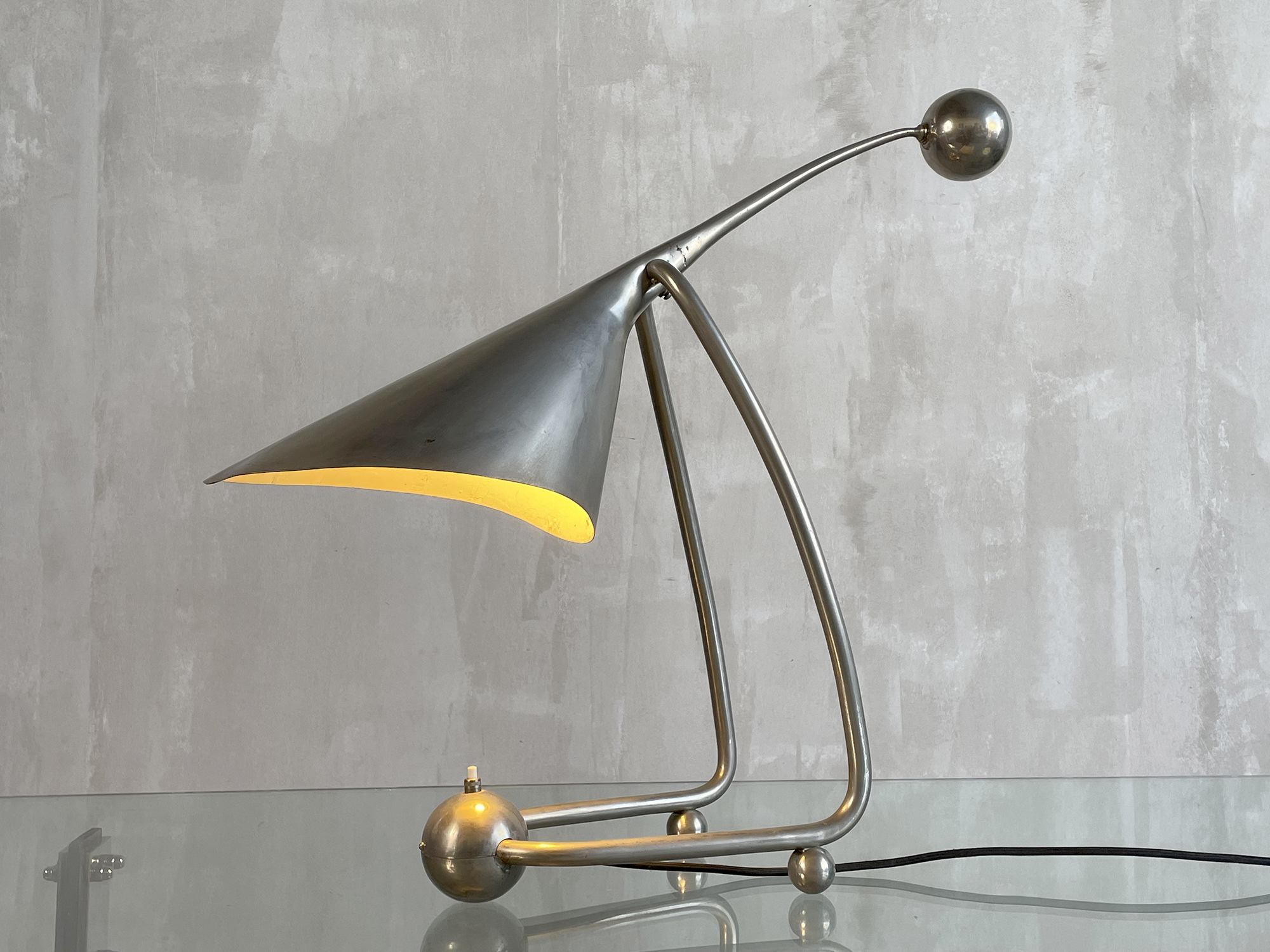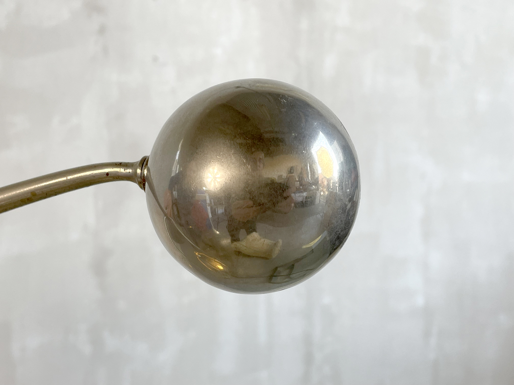 Spectaculaire lampe à balancier en métal poli, France 1960. Le réflecteur en forme de chapeau de sorcière est contrebalancé par un contrepoids, le mouvement de bascule est freiné par une vis. La base tubulaire est reliée par une sphère munie d'un interrupteur à bouton-poussoir.
