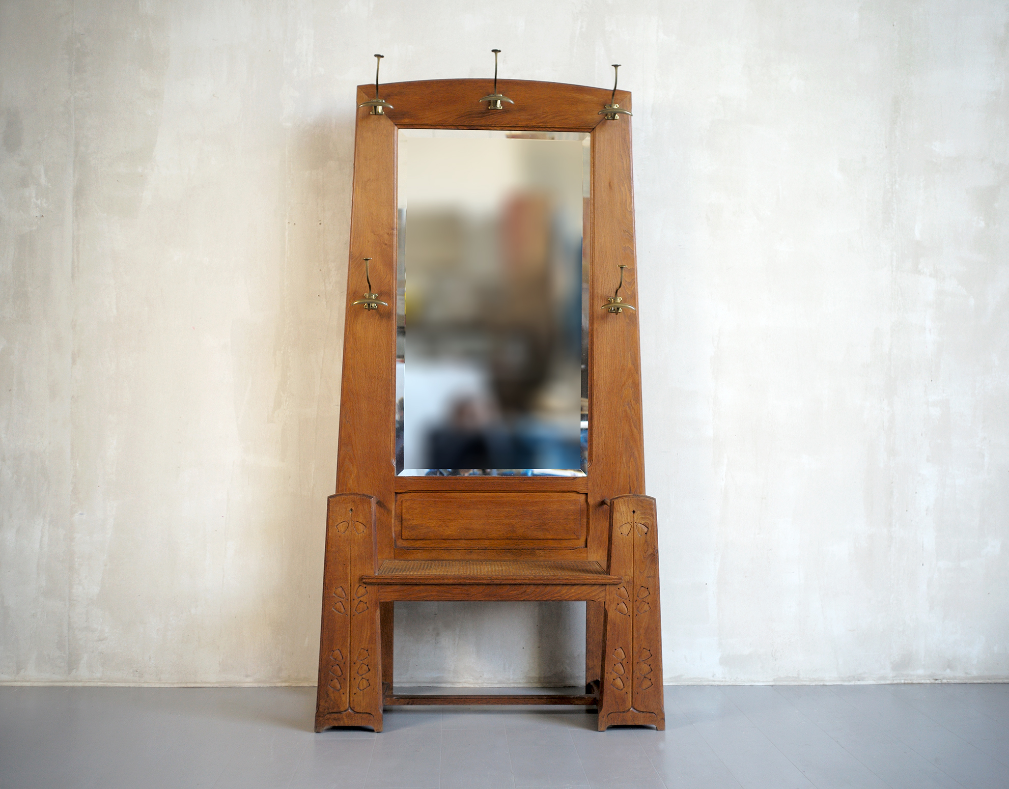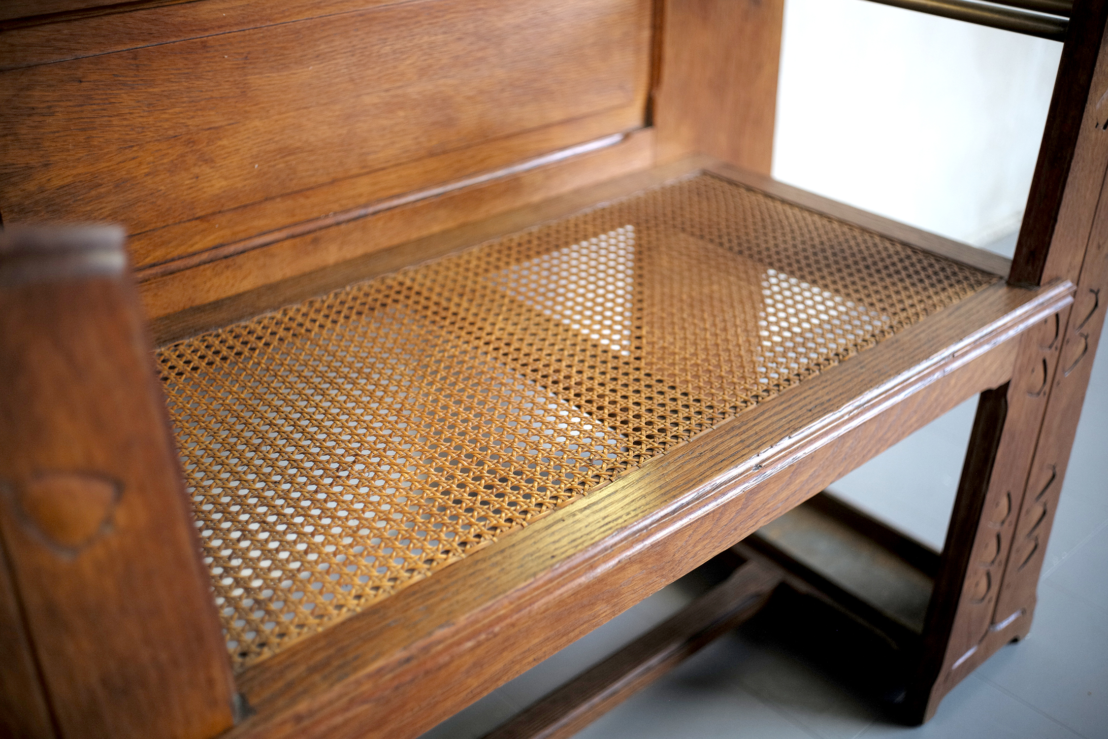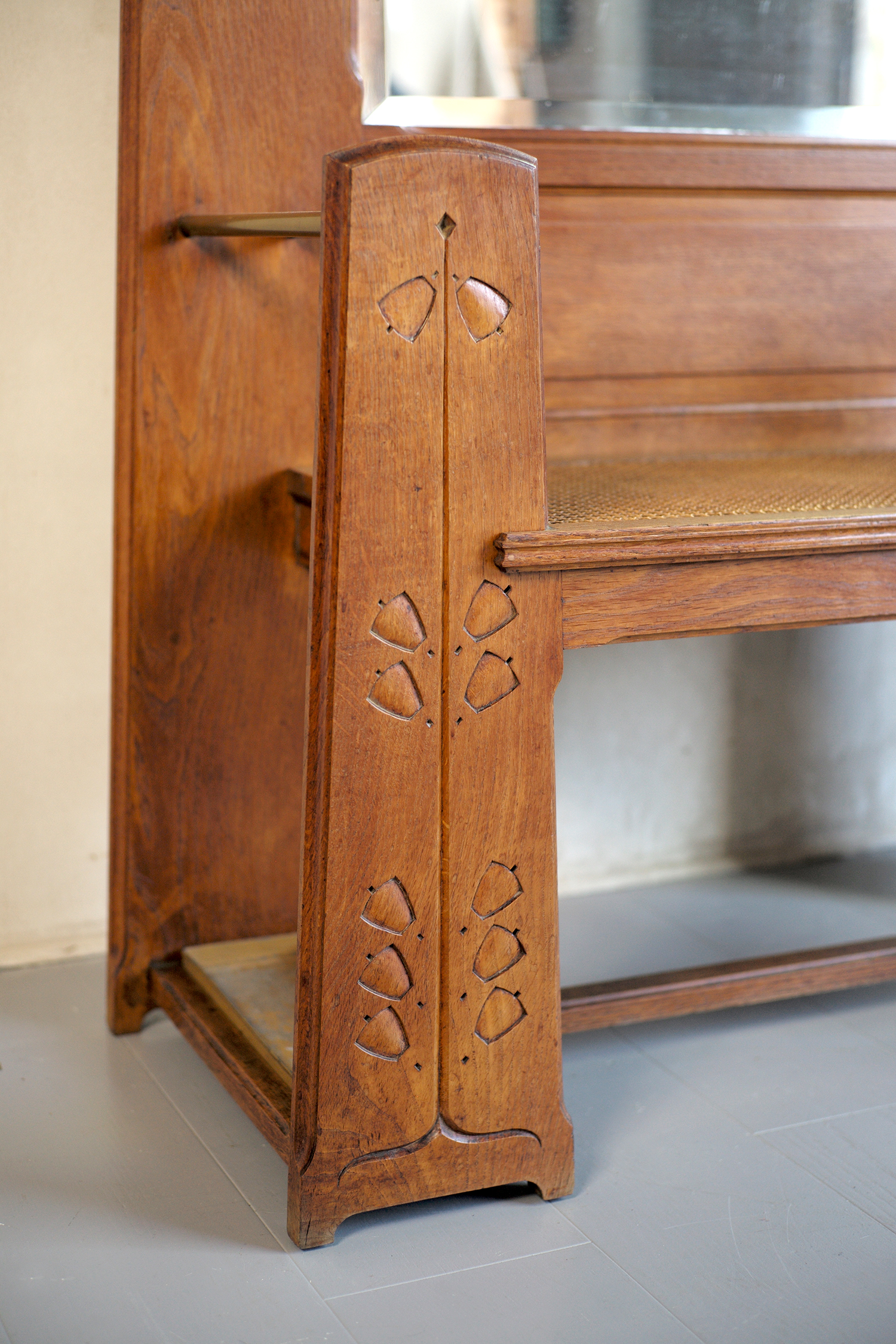 Meuble d'entrée en chêne blond Arts and Crafts, 1900. Les montants du banc canné sont décorés de campanules stylisées, le grand miroir biseauté est entouré de cinq patères en laiton patiné. Pour ranger vos parapluies et vos cannes, deux logements sont disposés de part et d'autre du siège, les bacs en zinc sont originaux.