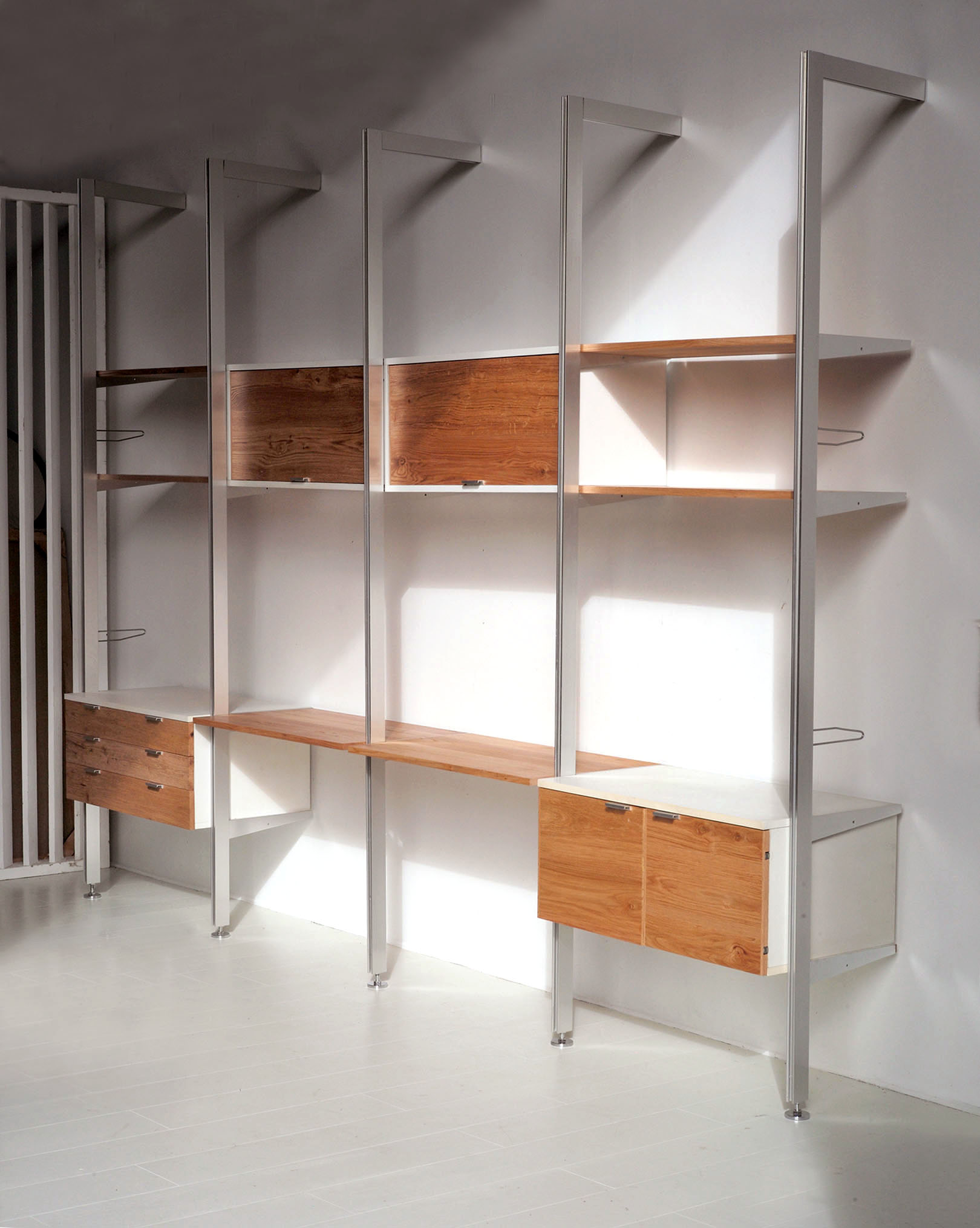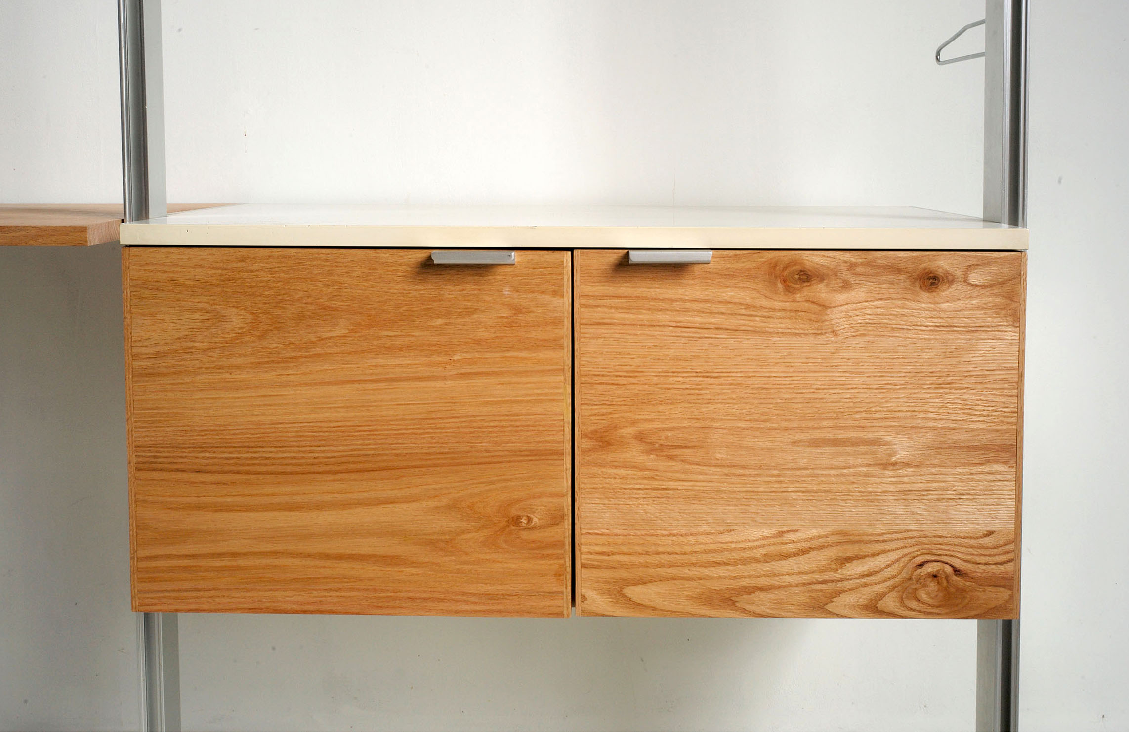 Version unique de la bibliothèque CCS de Georges Nelson en mélaminé blanc et chêne d'Amérique, éditée par Mobilier international, 1970. Les façades et étagères ont été refaites en chêne rouge massif. Equipée de 5 colonnes sol-mur, cette grande bibliothèque présente au premier niveau un meuble à trois tiroirs, un meuble à deux portes et deux plateaux de bureau. Au deuxième niveau, on retrouve deux caissons à portes escamotables et quatre étagères. 4 serre-livres complètent l'équipement.