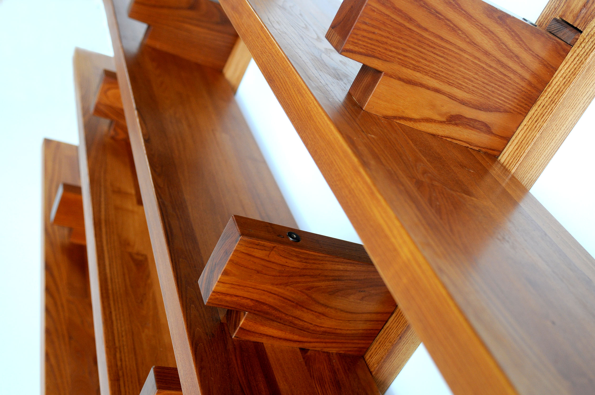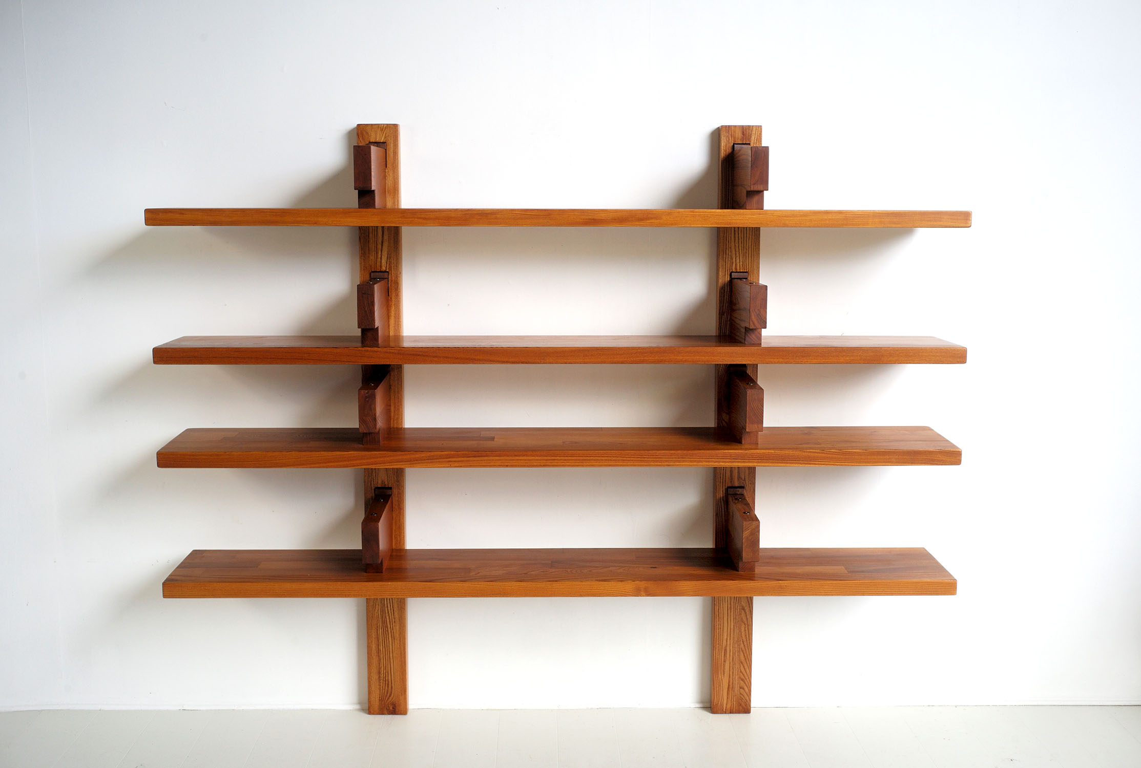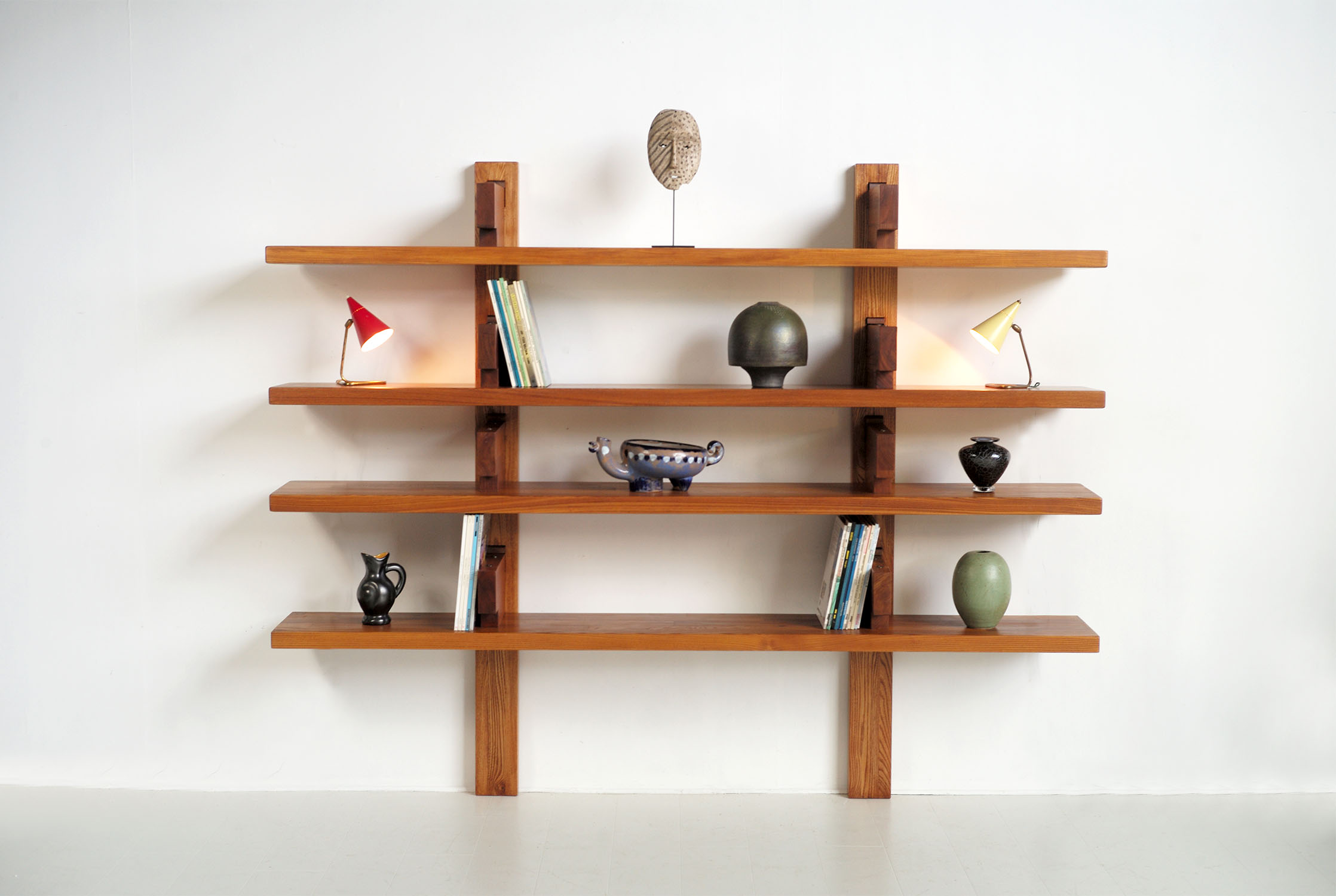 Ancienne édition de la bibliothèque B17b en Orme français de Pierre Chapo, France 60'. Présentée au salon des Arts Ménagers en 1967, cette bibliothèque casse les codes en plaçant les supports au dessus des plateaux. Le choix de l'Orme, la qualité des assemblages et le dessin hors norme donnent à cette version "B" de 226 cm de longueur une présence extraordinaire.