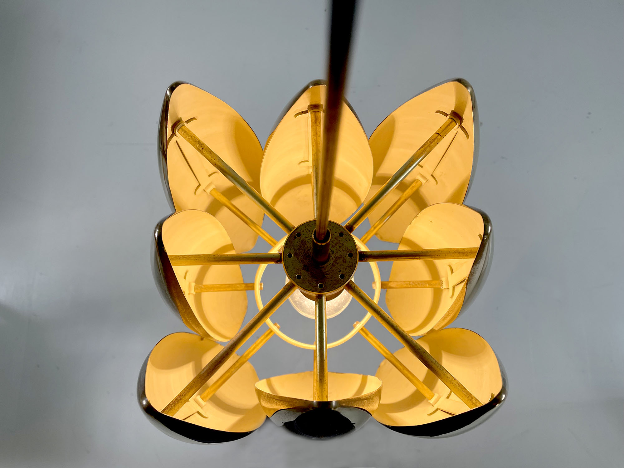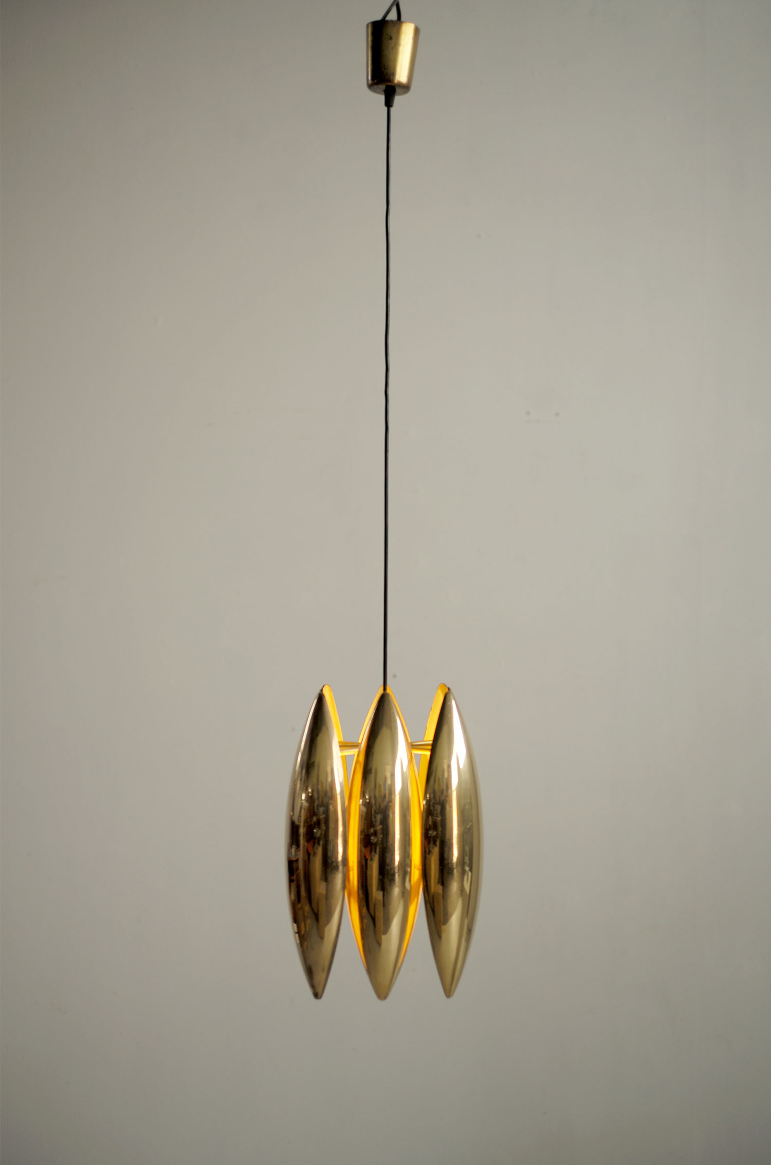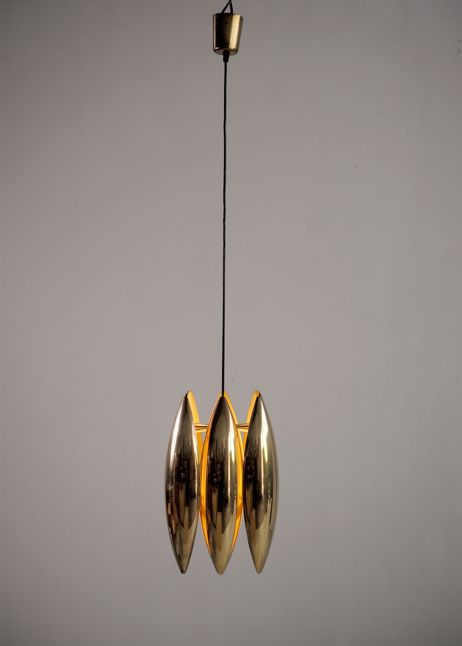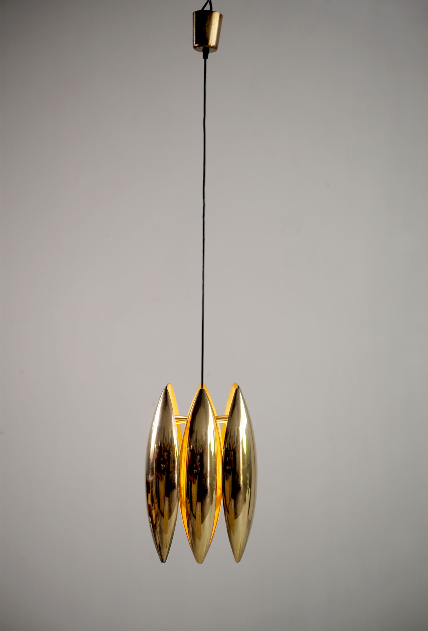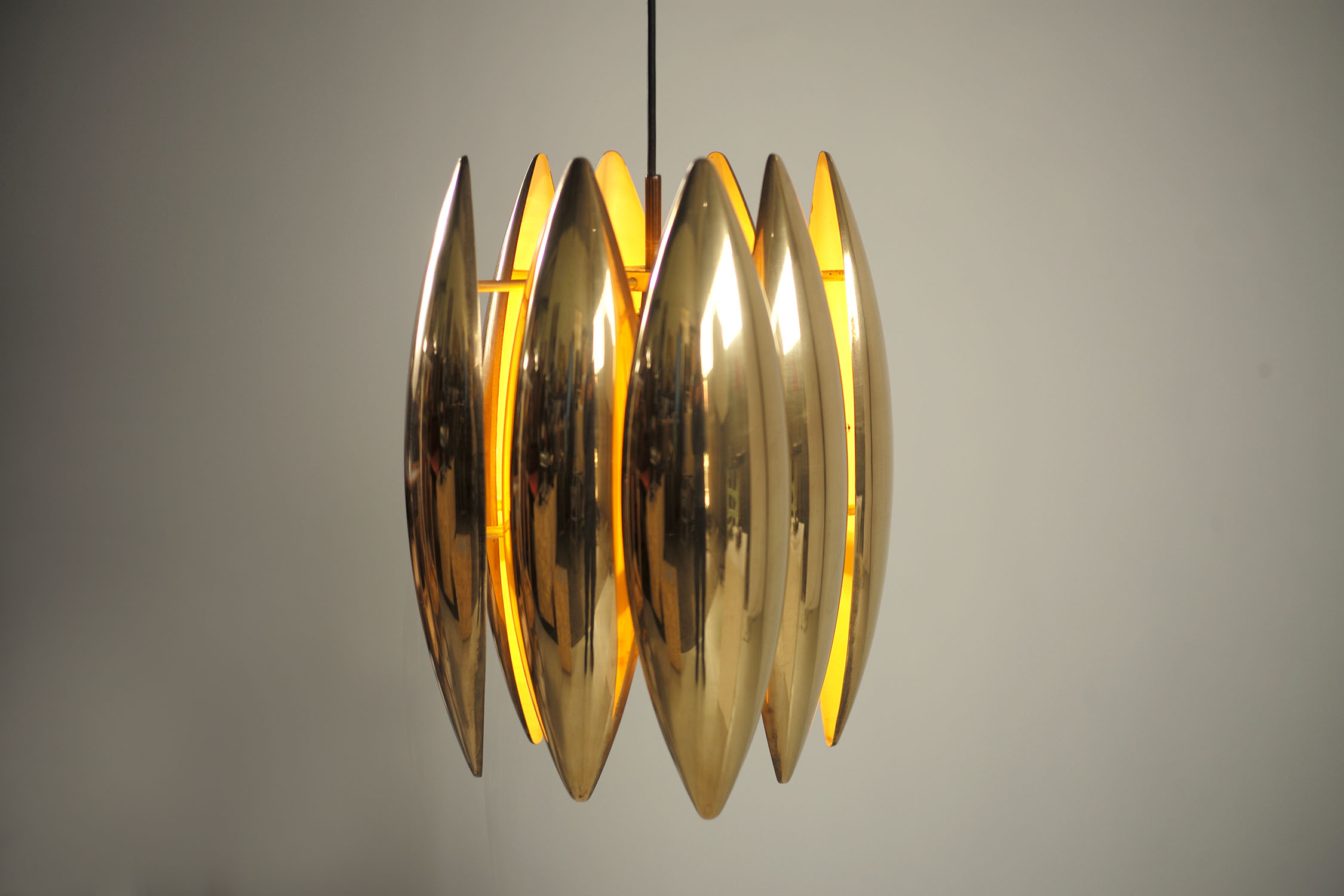 Suspension Kastor en laiton doré par Jo Hmmerborg pour Fog & Mørup, Danemark 1969. Les 8 réflecteurs sont laqués blanc à l'intérieur, le cache-bélière est en laiton. De très belle qualité, ce luminaire est l'une des plus emblématiques créations de Jo Hammerborg. la hauteur totale est de 118 cm (réglable par serre-fil).