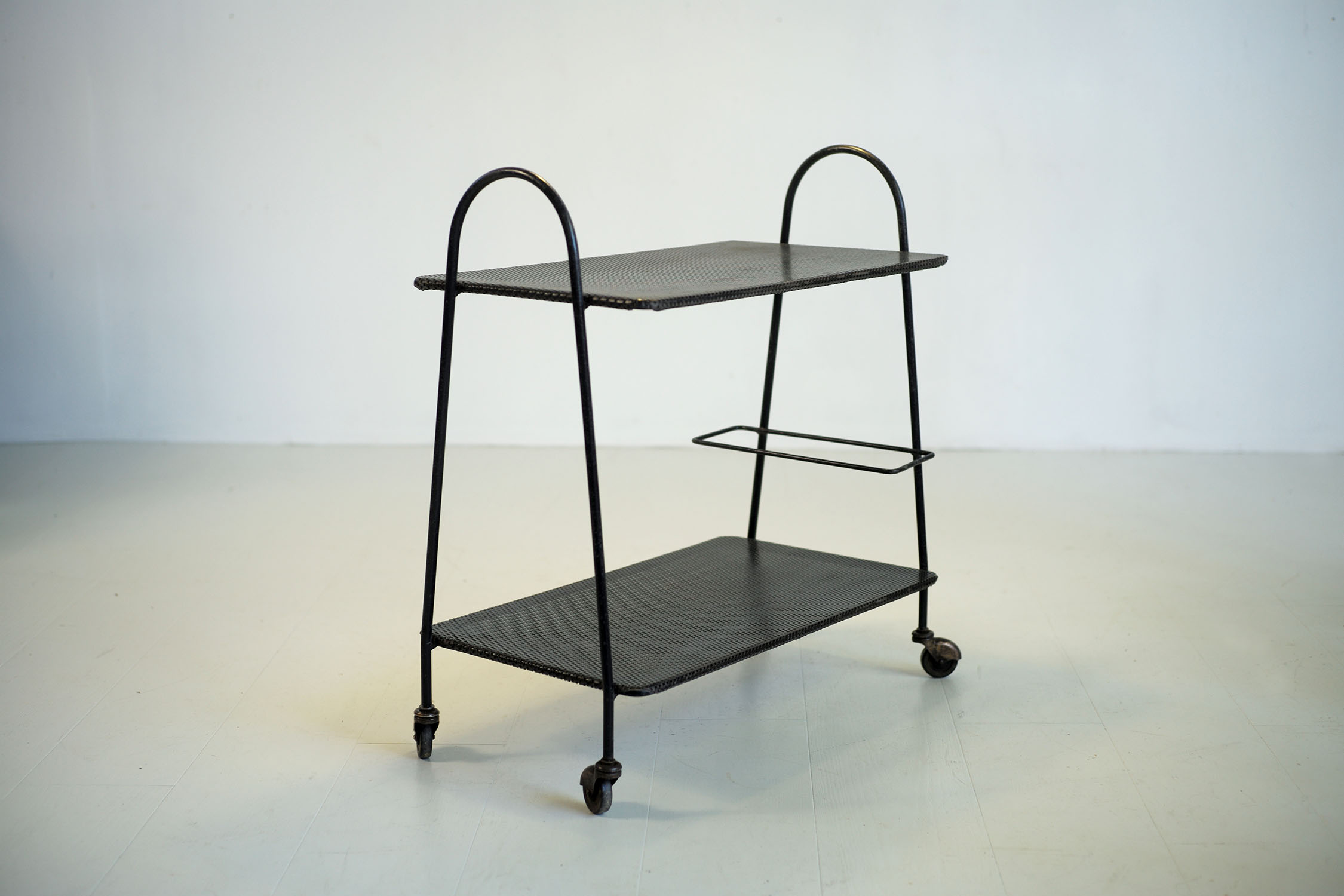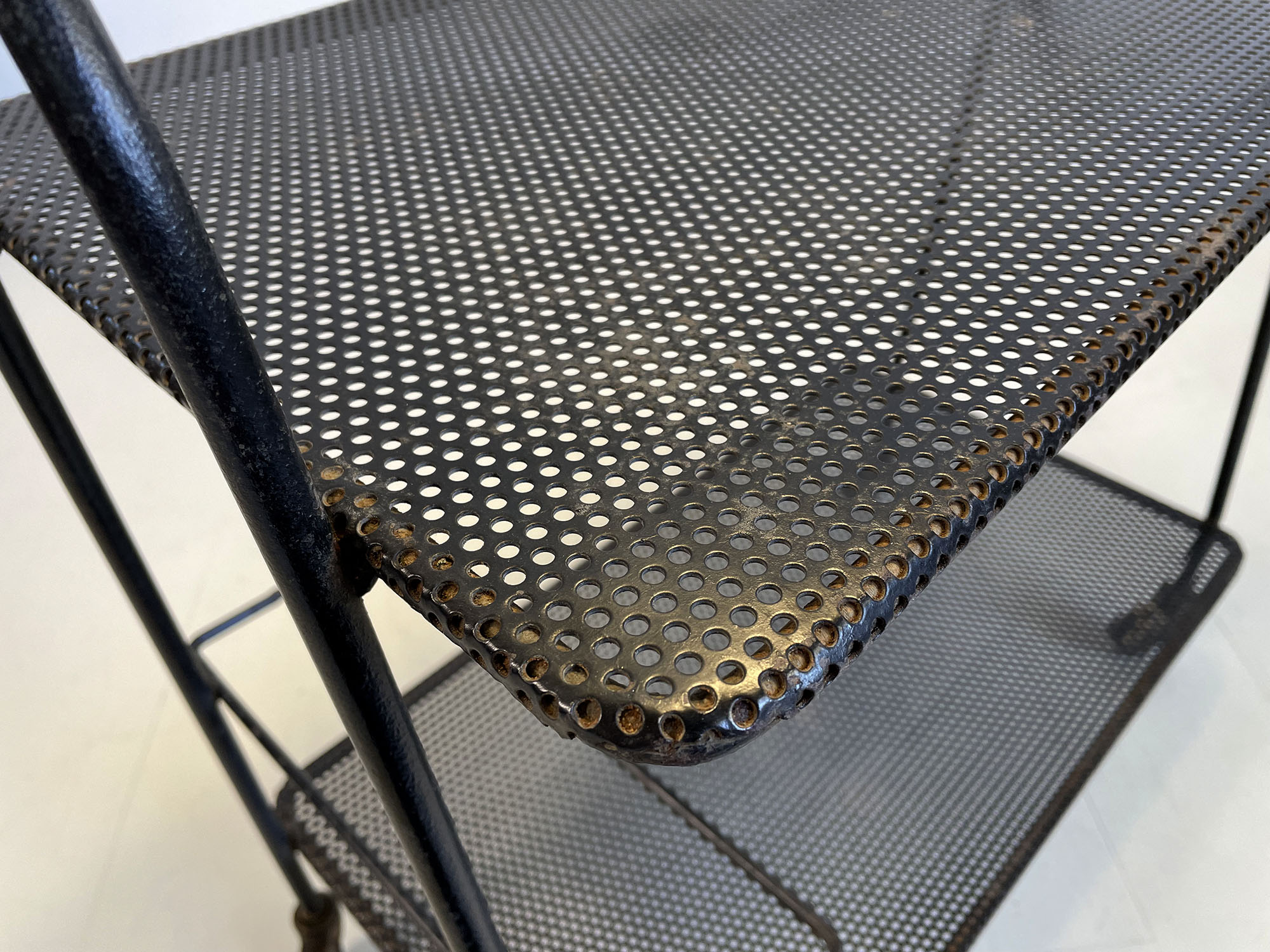 Bar roulant à 2 plateaux en métal perforé laqué noir, France 1950. Le plateau inférieur est doté d'un porte bouteille