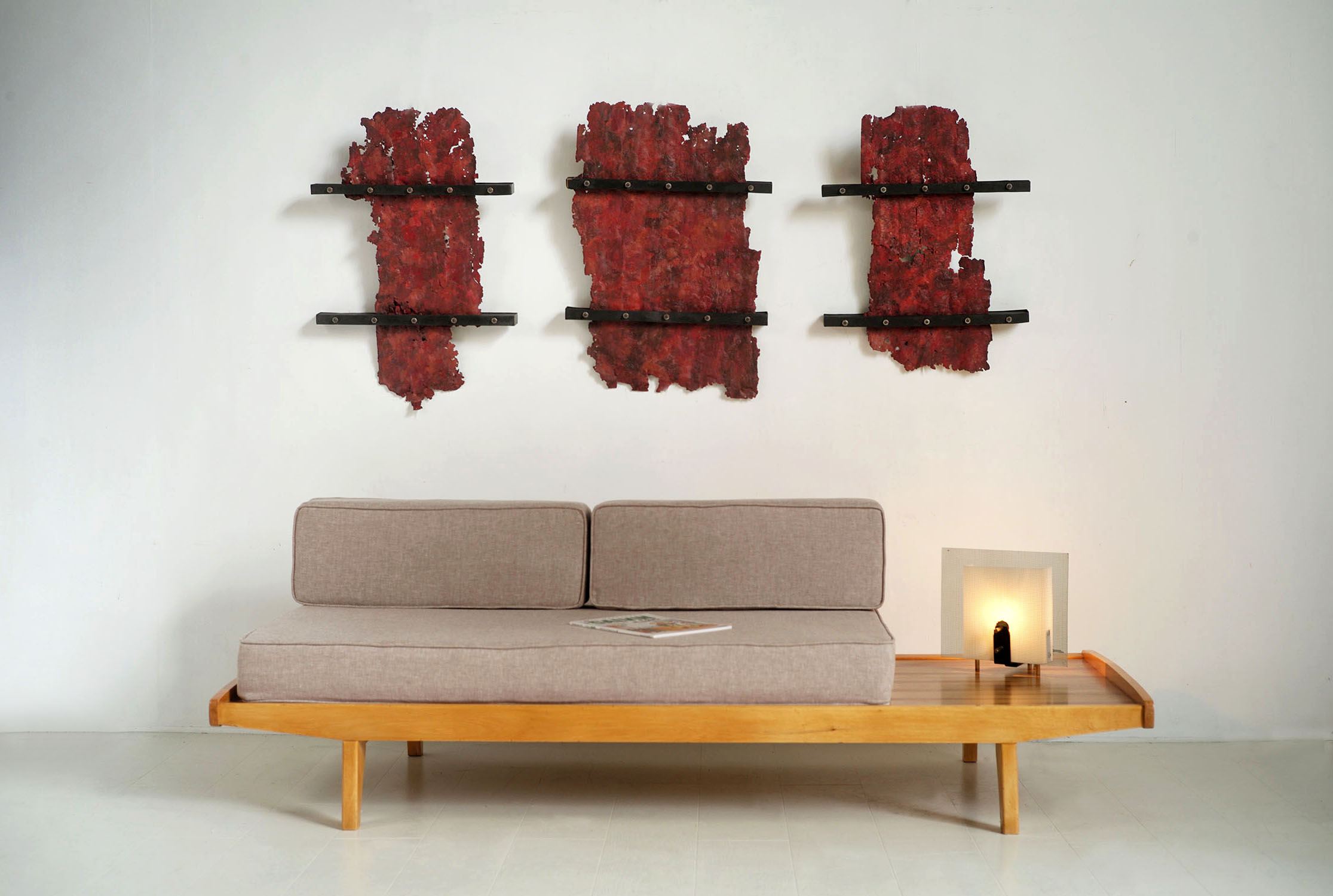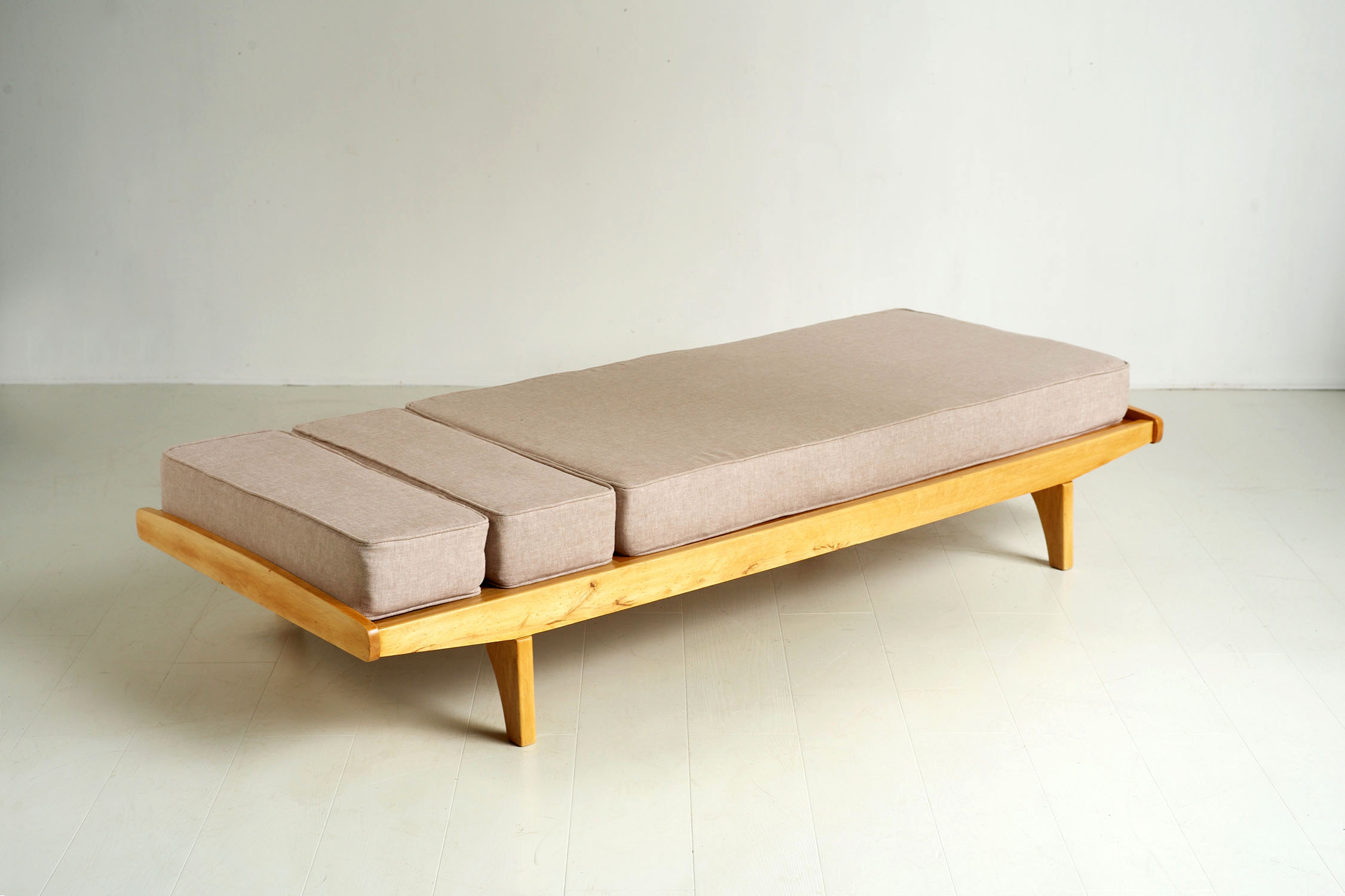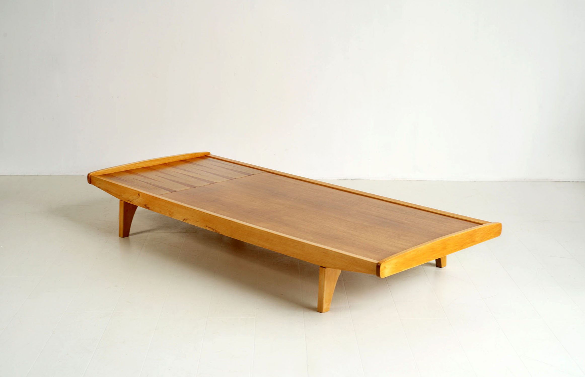 Lit de repos, France 1950. Le plateau se compose d'une partie plaquée en chêne et d'une tablette incrustée de triangles opposés en chêne clair et en acajou. Le matelas et ses deux coussins sont recouverts de lin, ils peuvent être placés à plat pour faire un lit ou comme dossier. D'un très beau dessin, ce lit de jour offre de grandes similitudes avec le modèle 118 de Pierre Paulin édité par Meubles TV. Il est présenté avec un triptyque de Yan Kane, artiste plasticien écossais.