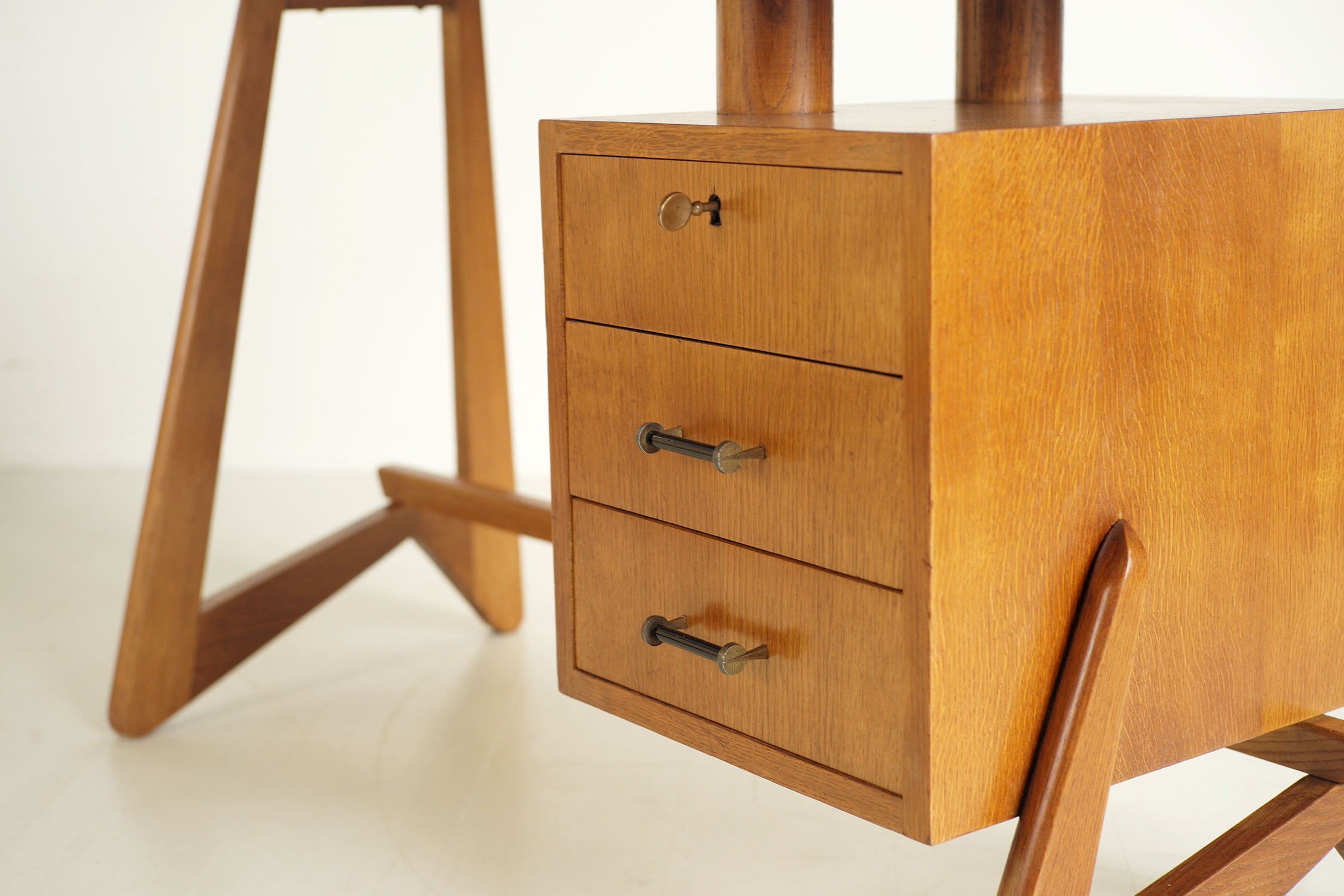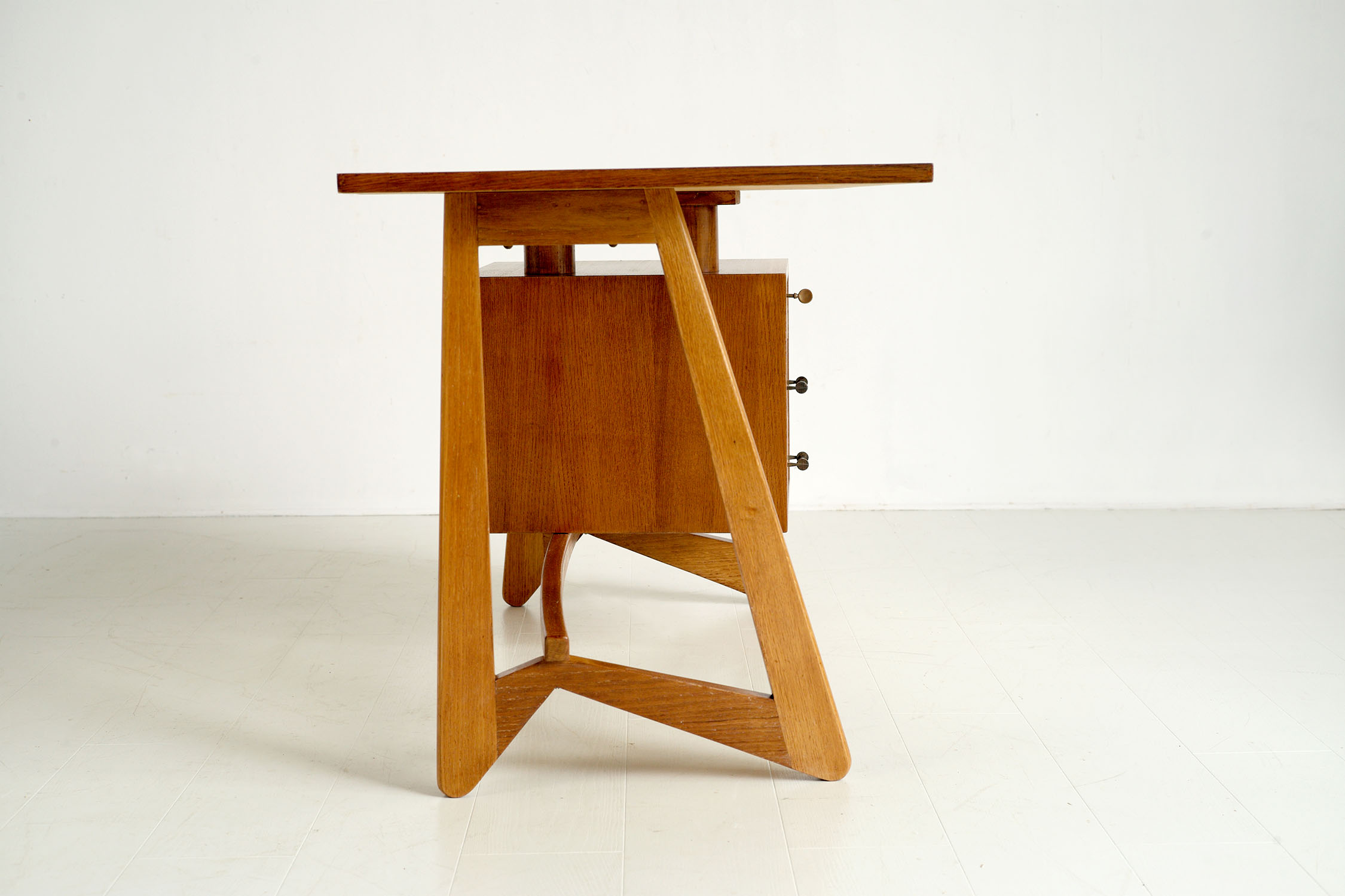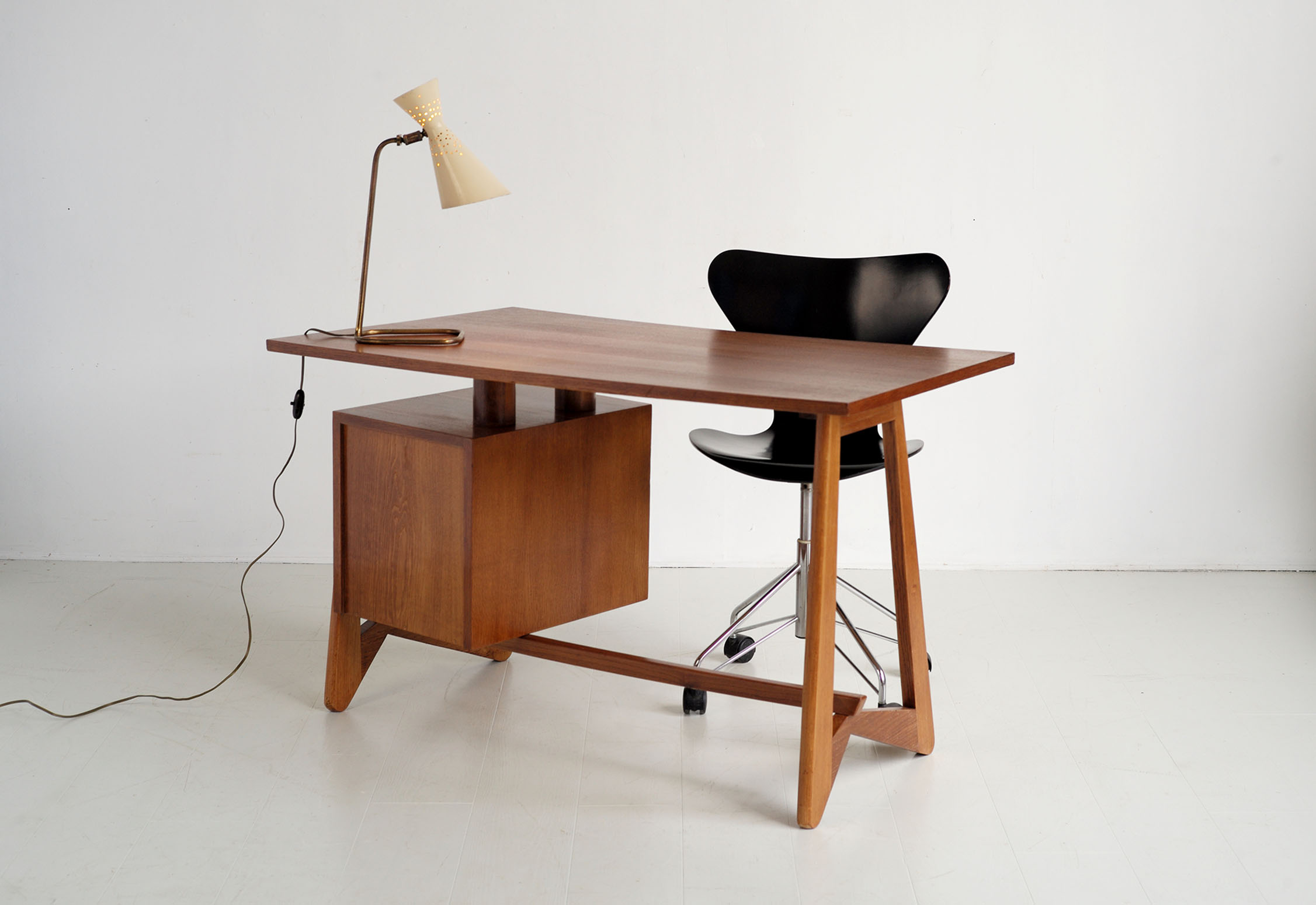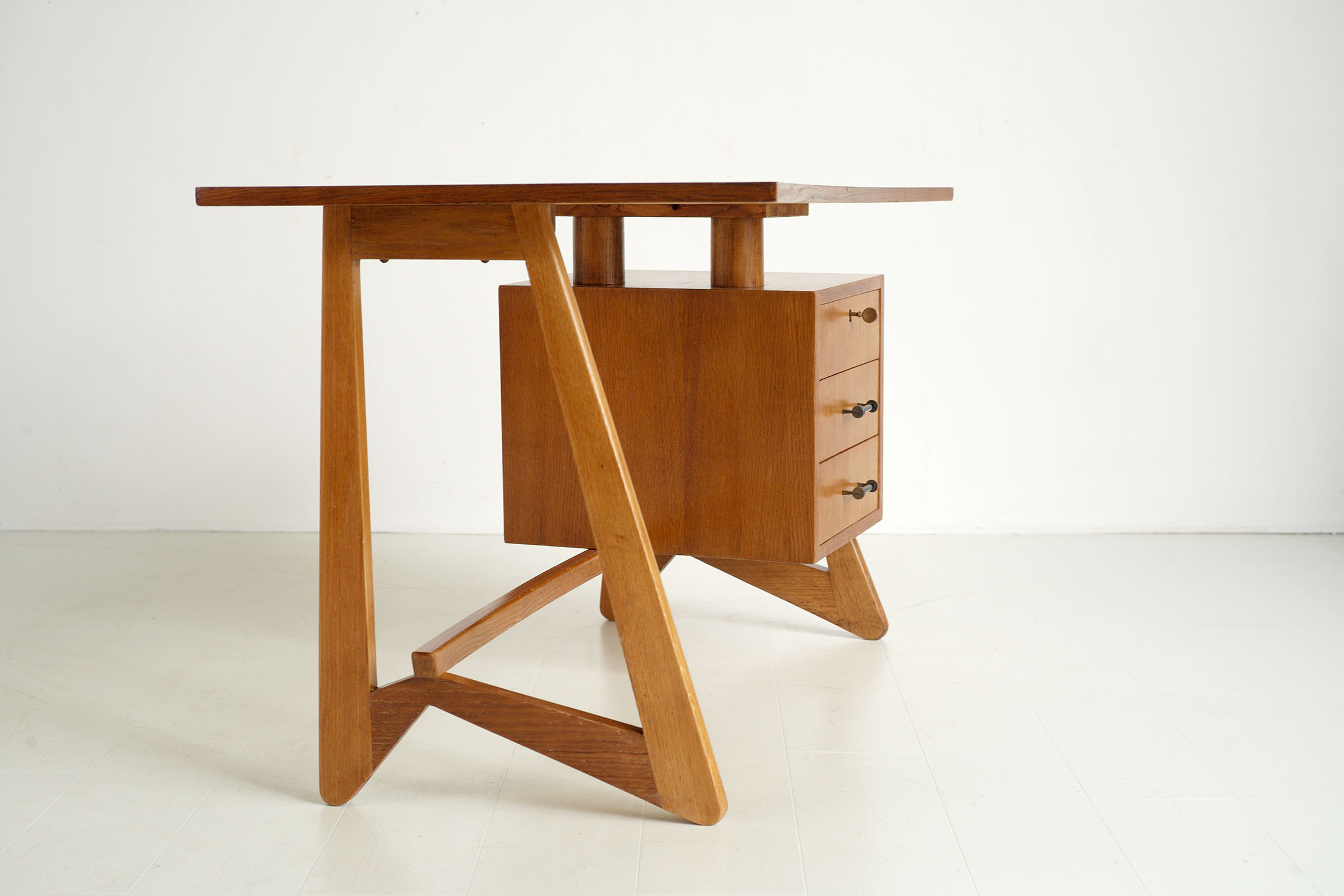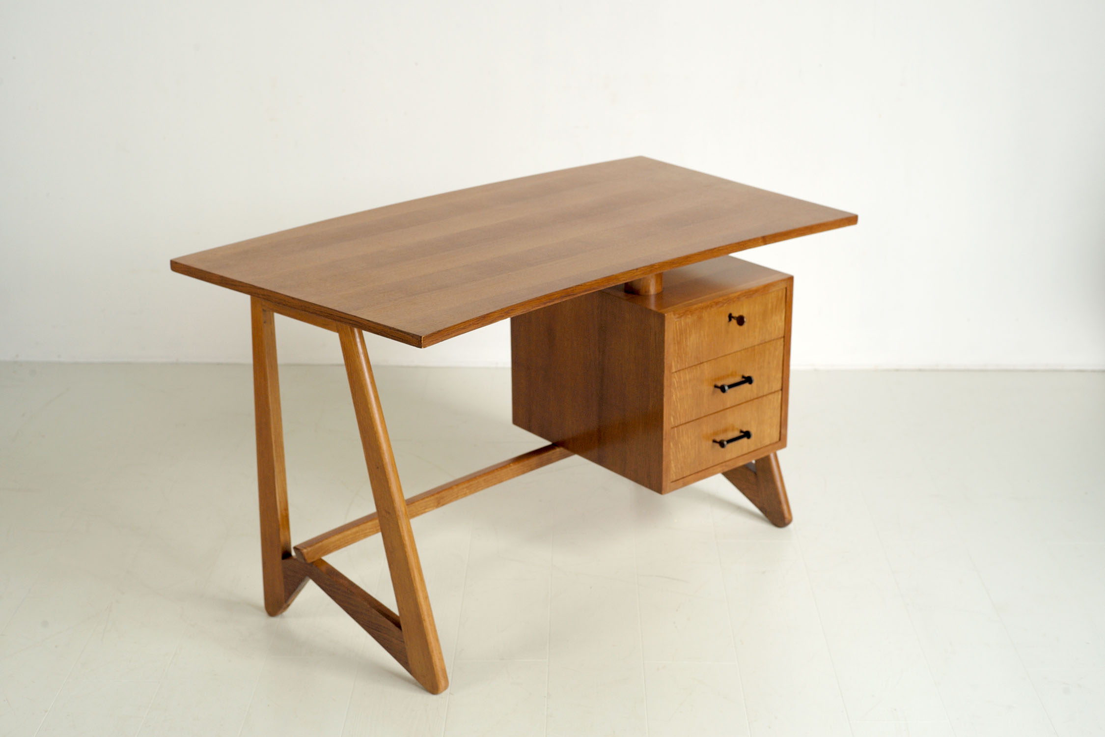 Bureau "75" en chêne, France 1950. Doté d'un caisson avec trois tiroirs sur le côté droit, ce bureau repose sur une base en chêne massif en forme de boomerang. Deux cylindres soutiennent le plateau incurvée, libérant l'espace au-dessus du caisson. Un plan de montage en français au crayon et un cachet sont visibles sous le plateau. Appelé "bureau 75" par son créateur (non identifié), cet exemplaire porterait le numéro 11 (marques au fond du tiroir). Très bel état.