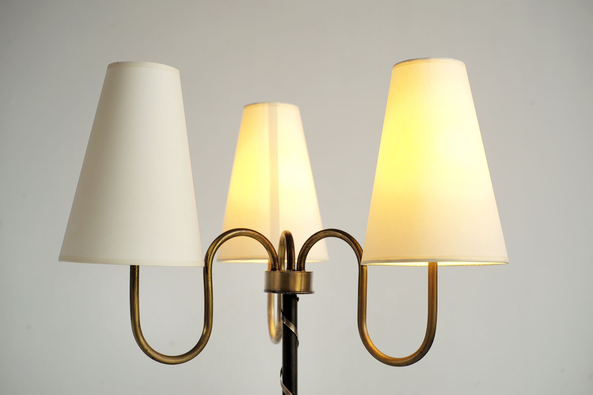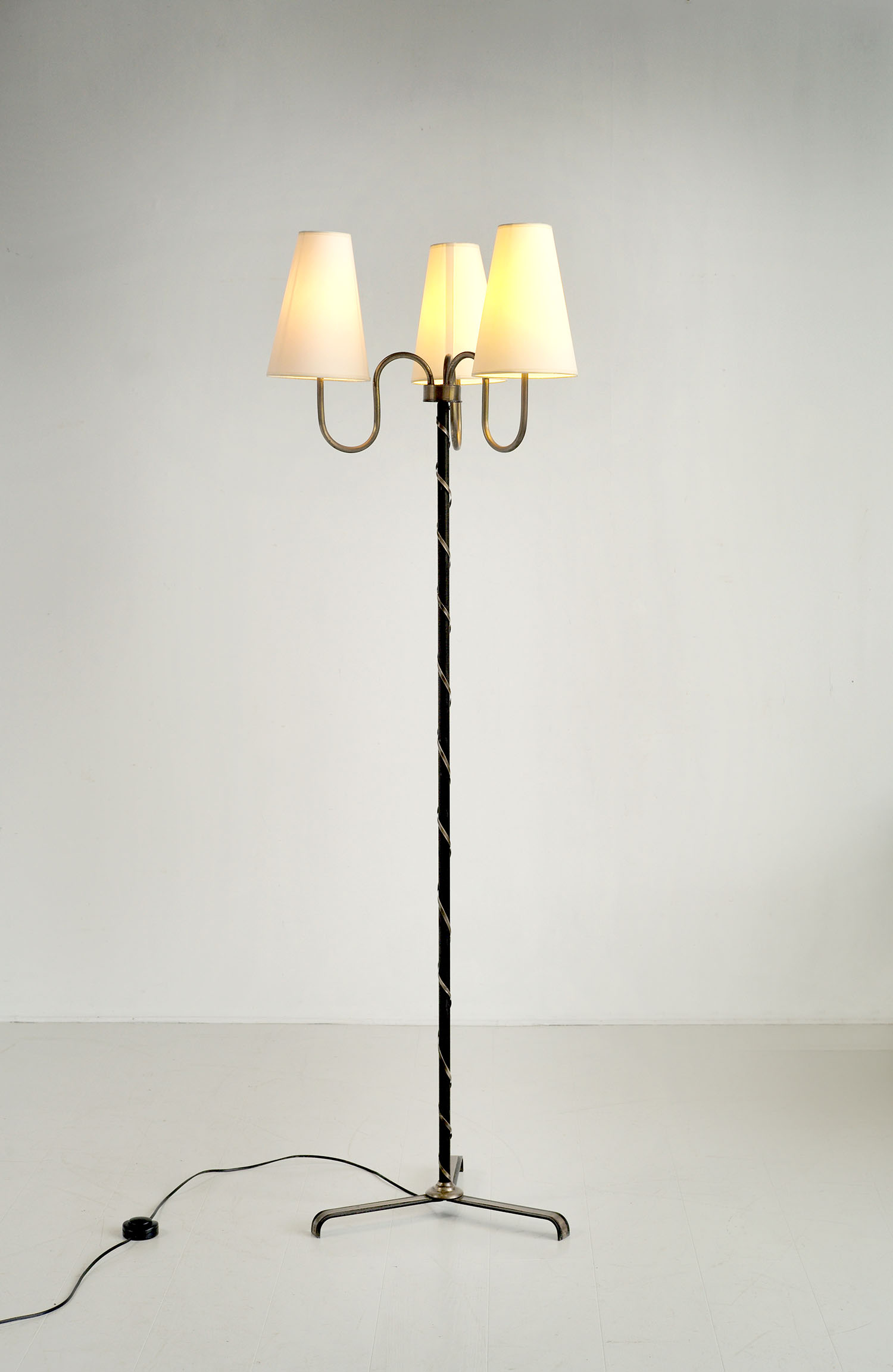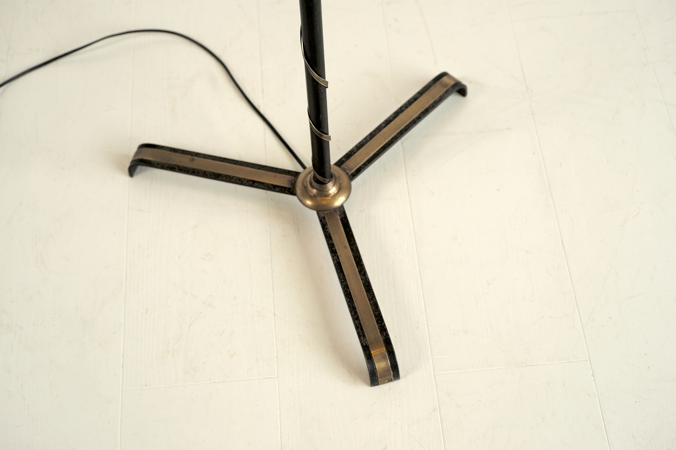 Lampadaire en métal laqué noir et laiton patiné, France 1960. Sur une base tripode, le fût tubulaire est rehaussé d'un ruban de laiton, les trois bras porte-réflecteur sont munis d'un interrupteur à poussoir.