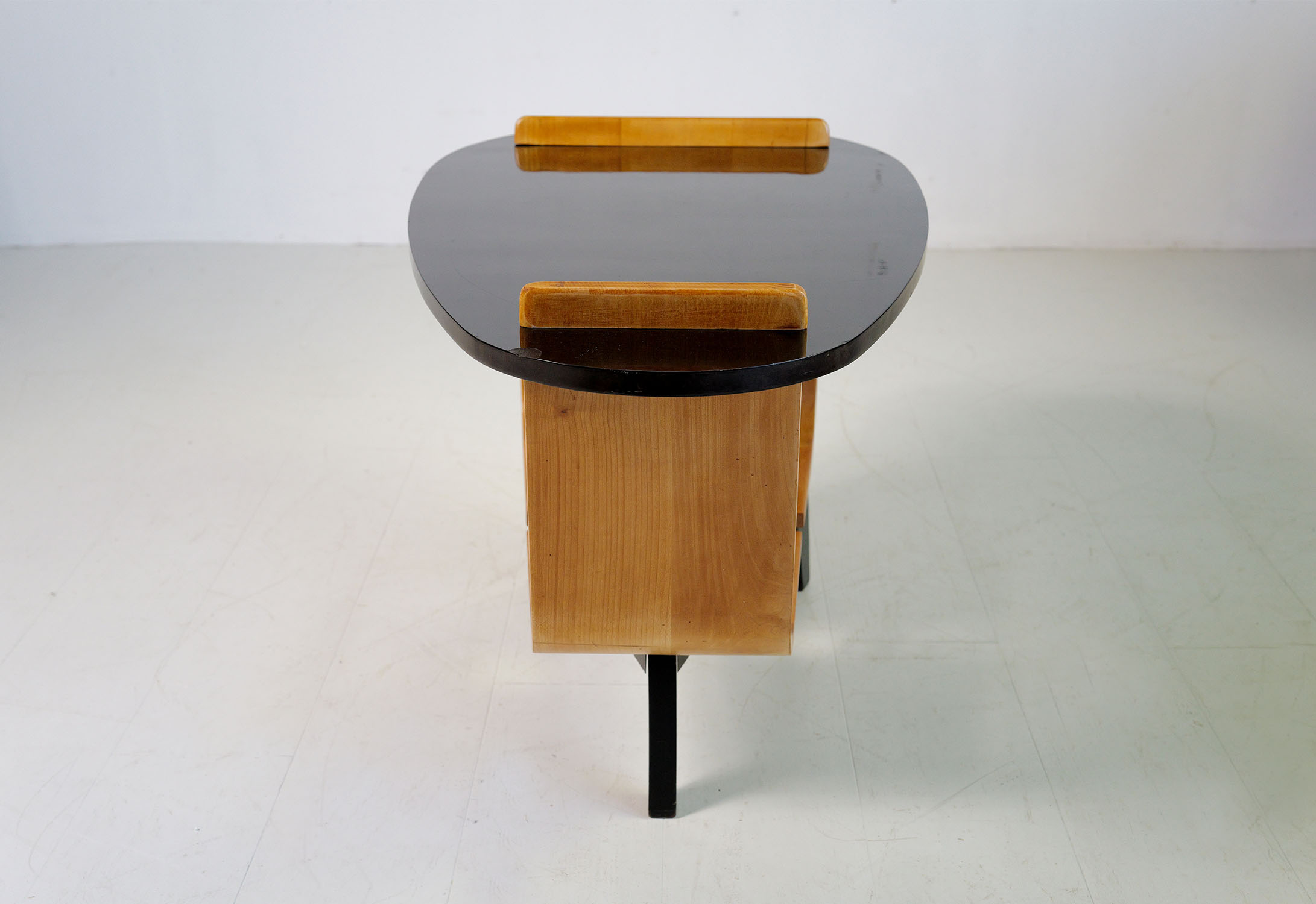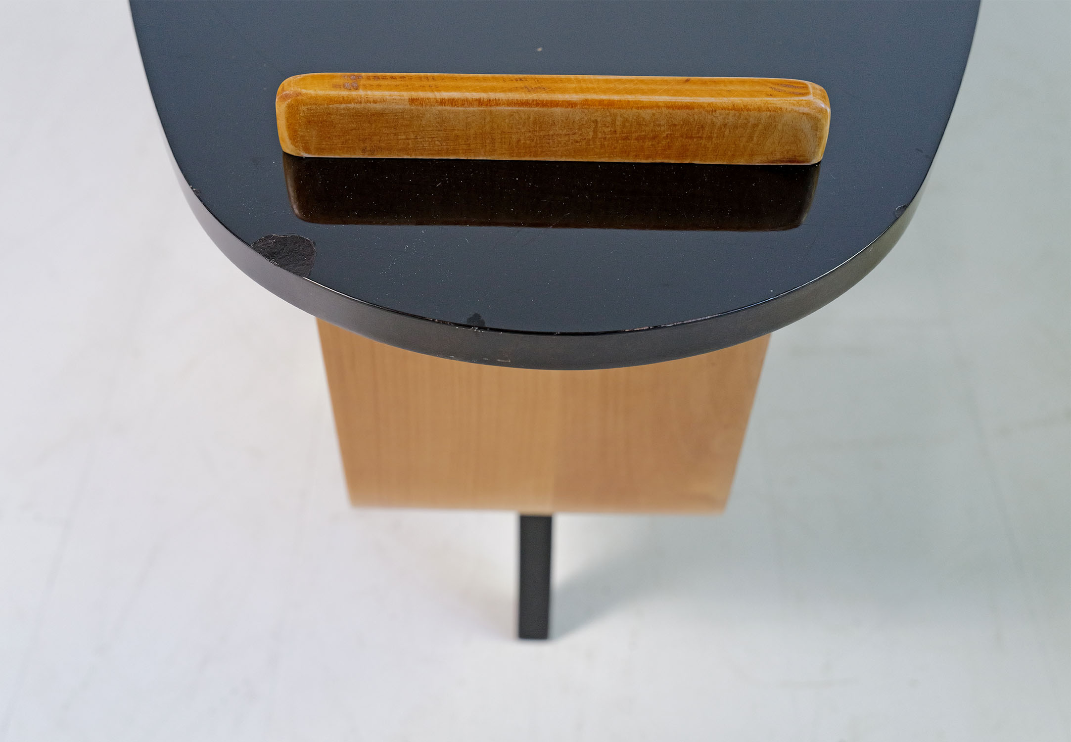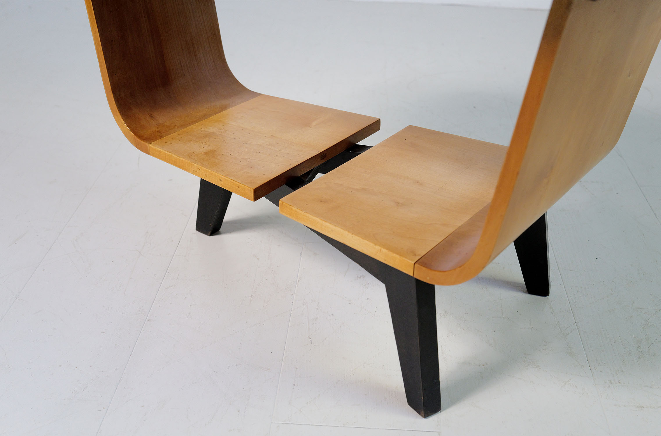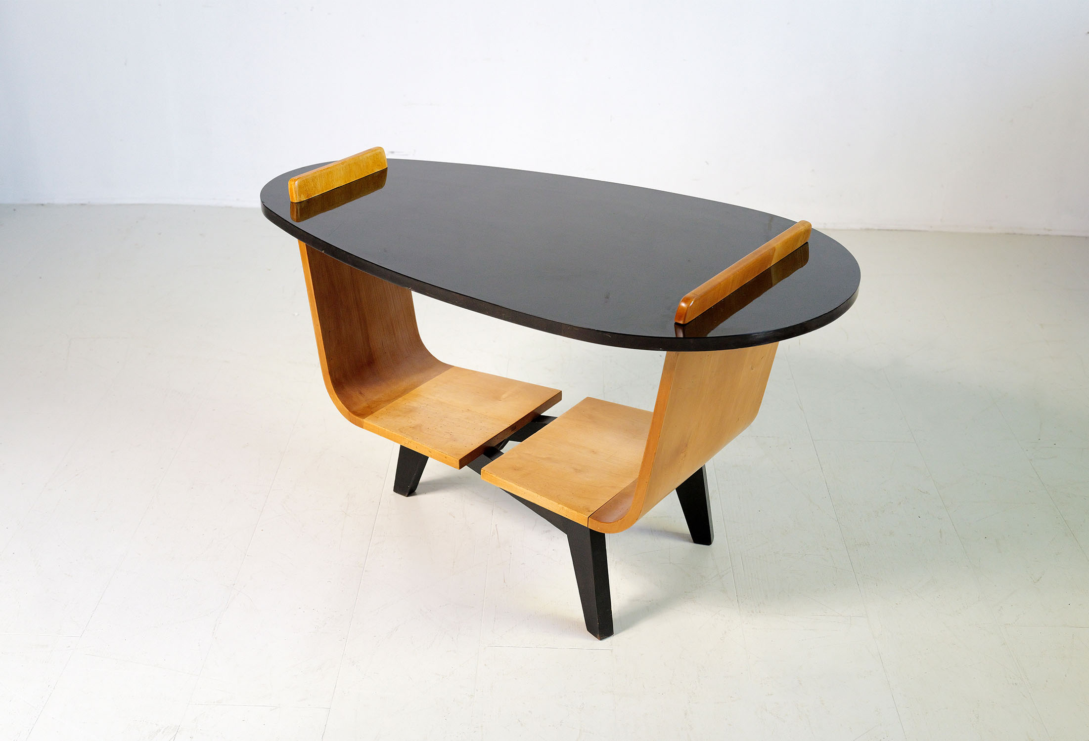 Exceptionnel guéridon tripode de Gustave Gautier, France 1955.Le plateau en formica noir repose sur un berceau en contreplaqué cintré plaqué frêne.
