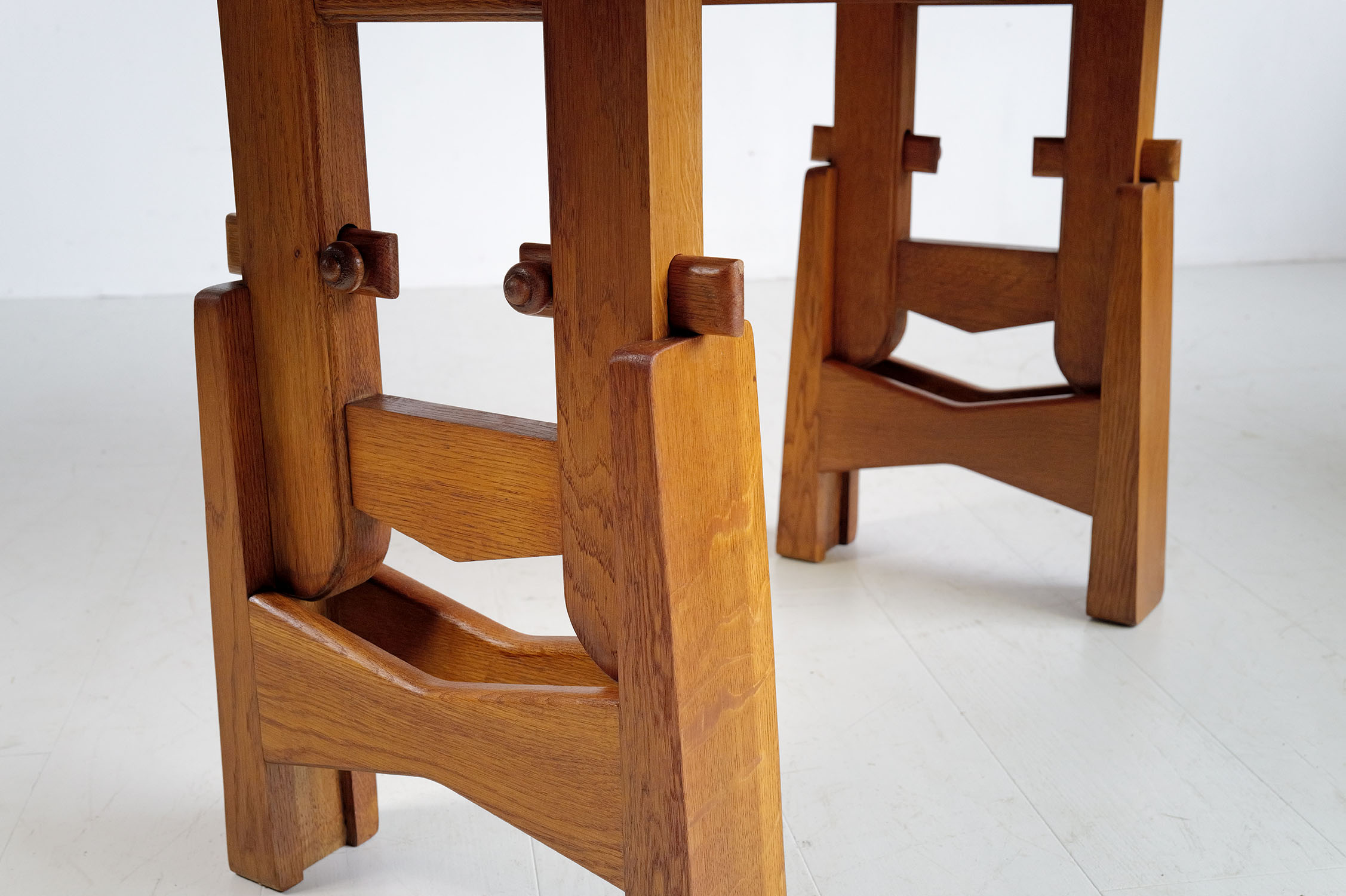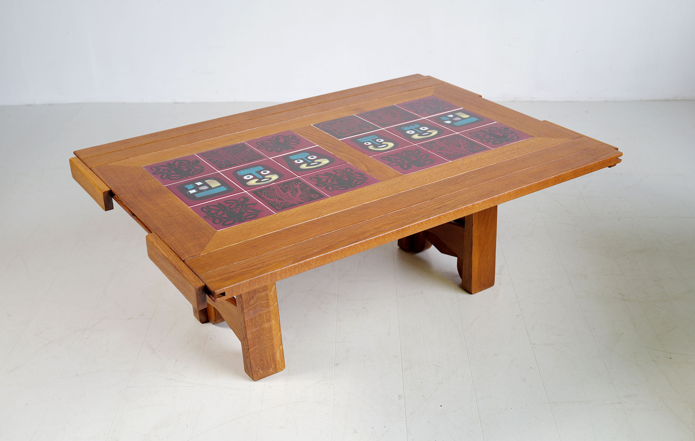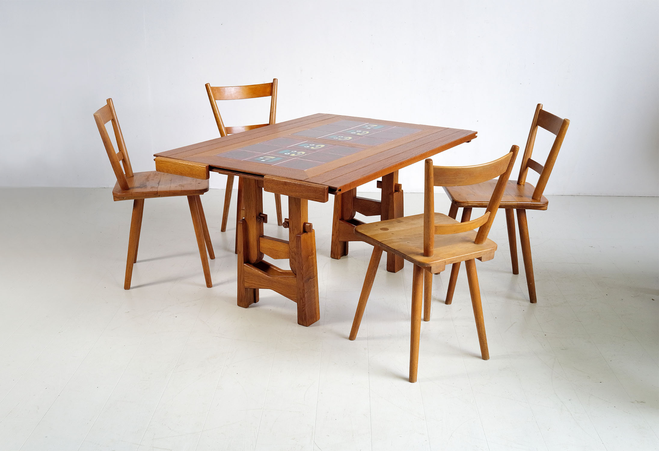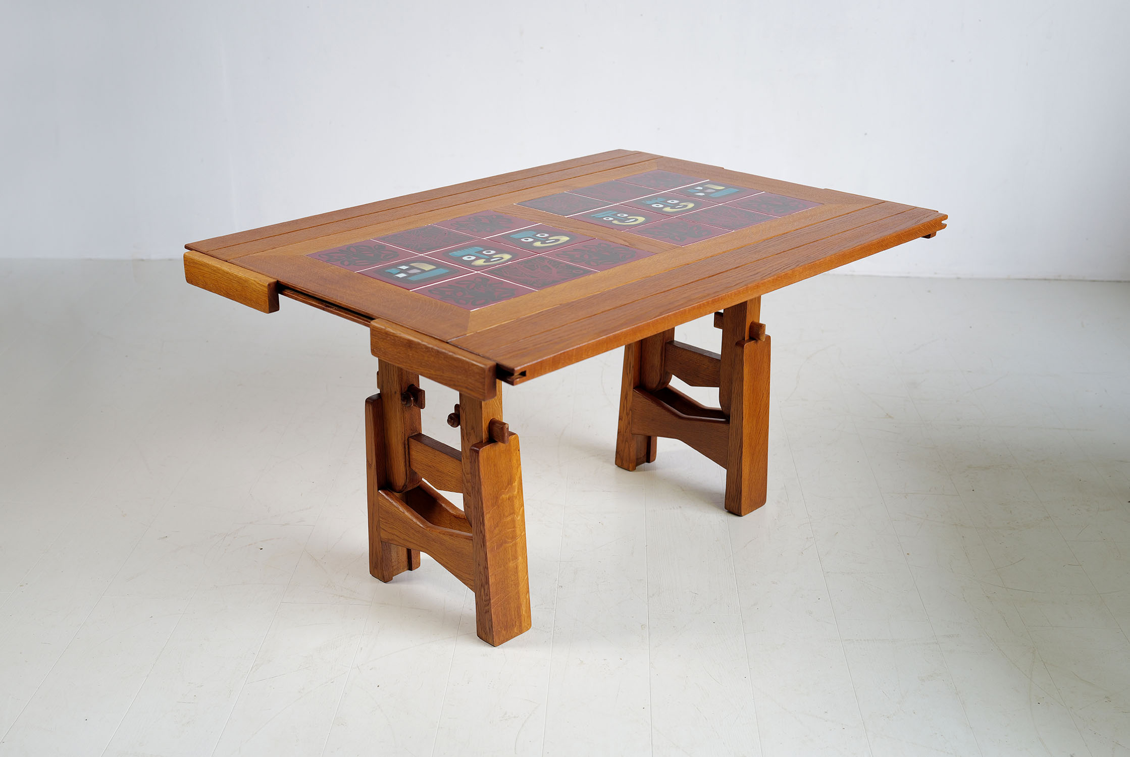 Robert Guillerme et Jacques Chambron, Table en chêne massif à décor de céramique, édition "Votre Maison", France 1960. Cette table à système possède des pieds coulissants et des rallonges rabattables, elle peut être utilisée comme table de salon ou table à manger (les dimensions du plateau vont de 126/62 cm à 126/91 cm, la hauteur varie de 49 cm à 69 cm). Très simple d'utilisation, chaque modification se fait au moyen de taquets et de glissières, la qualité de la menuiserie assurant une très bonne stabilité dans chaque position. Le plateau est décoré de 18 carreaux de céramique de Boleslaw Danikowski.